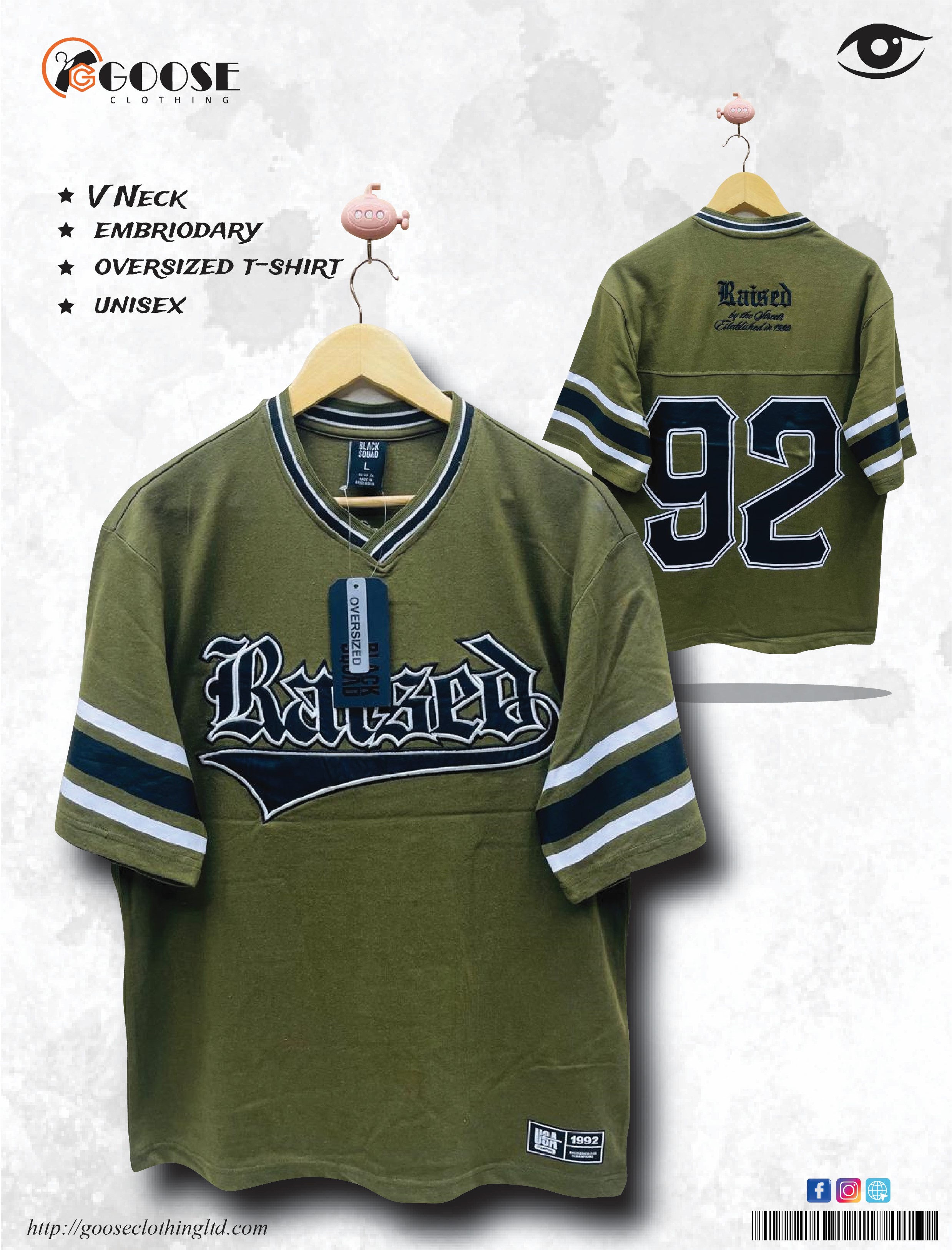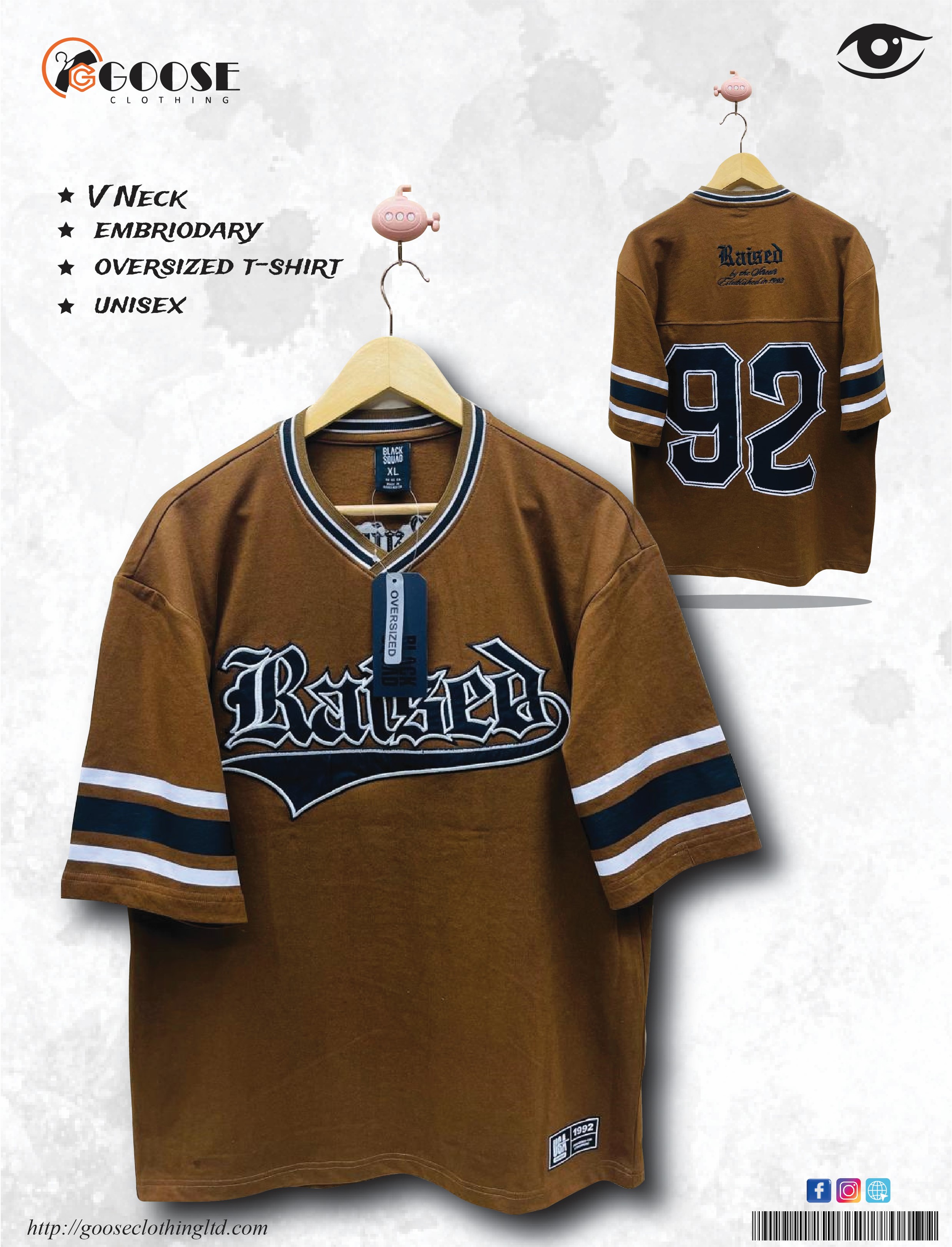 This is a UNISEX Oversized T-Shirt from GOOSE CLOTHING styled after an American sports jersey, presented in a muted Taupe/Muted Brown-Grey color. The shirt features a V-Neck with contrast ribbed trim and wide, striped sleeve accents. The front chest features bold "Raised" lettering applied using EMBROIDARY. The back reinforces the athletic theme with a large printed number "92" and additional graphic text, giving the garment a retro, streetwear aesthetic.