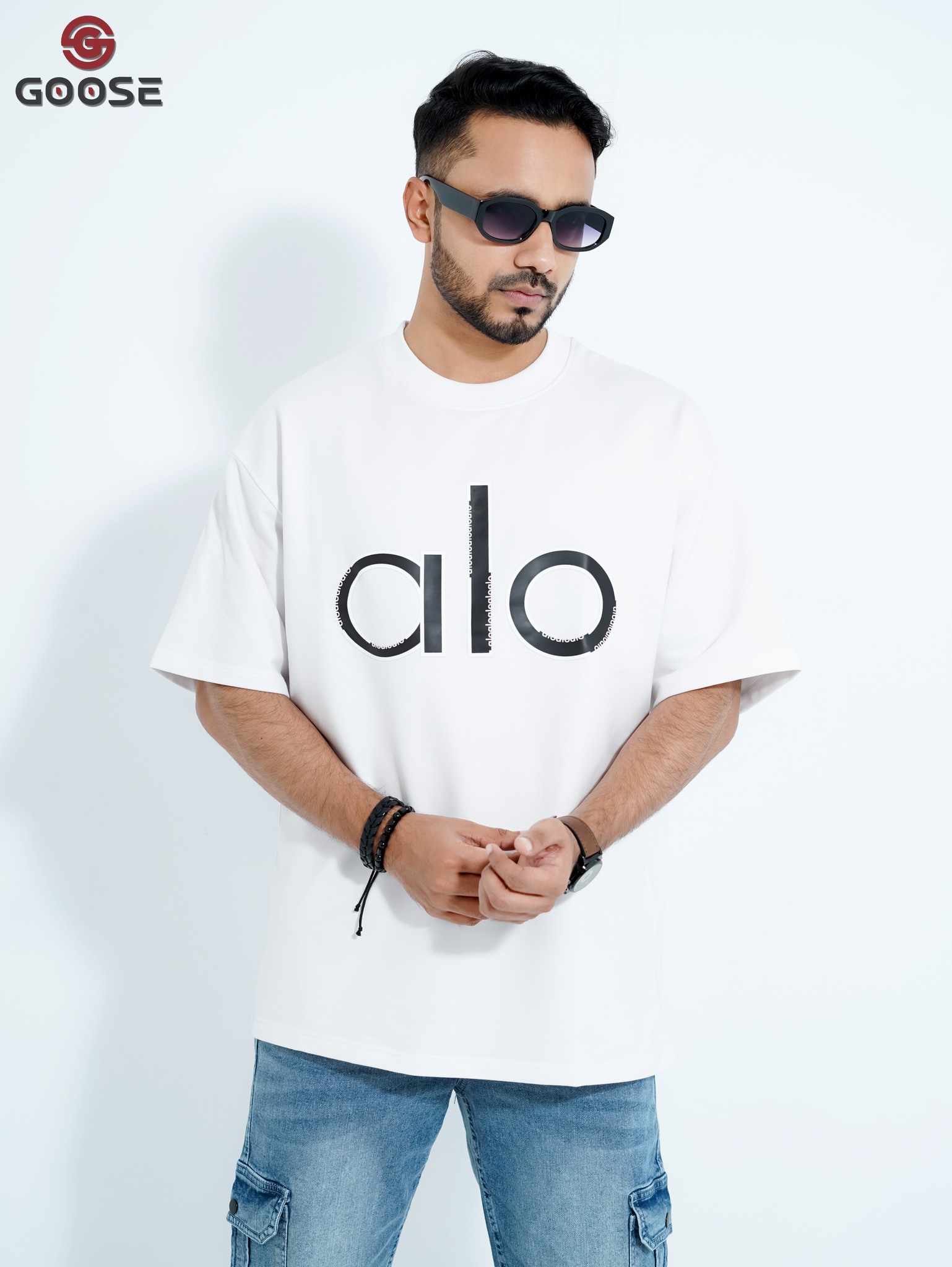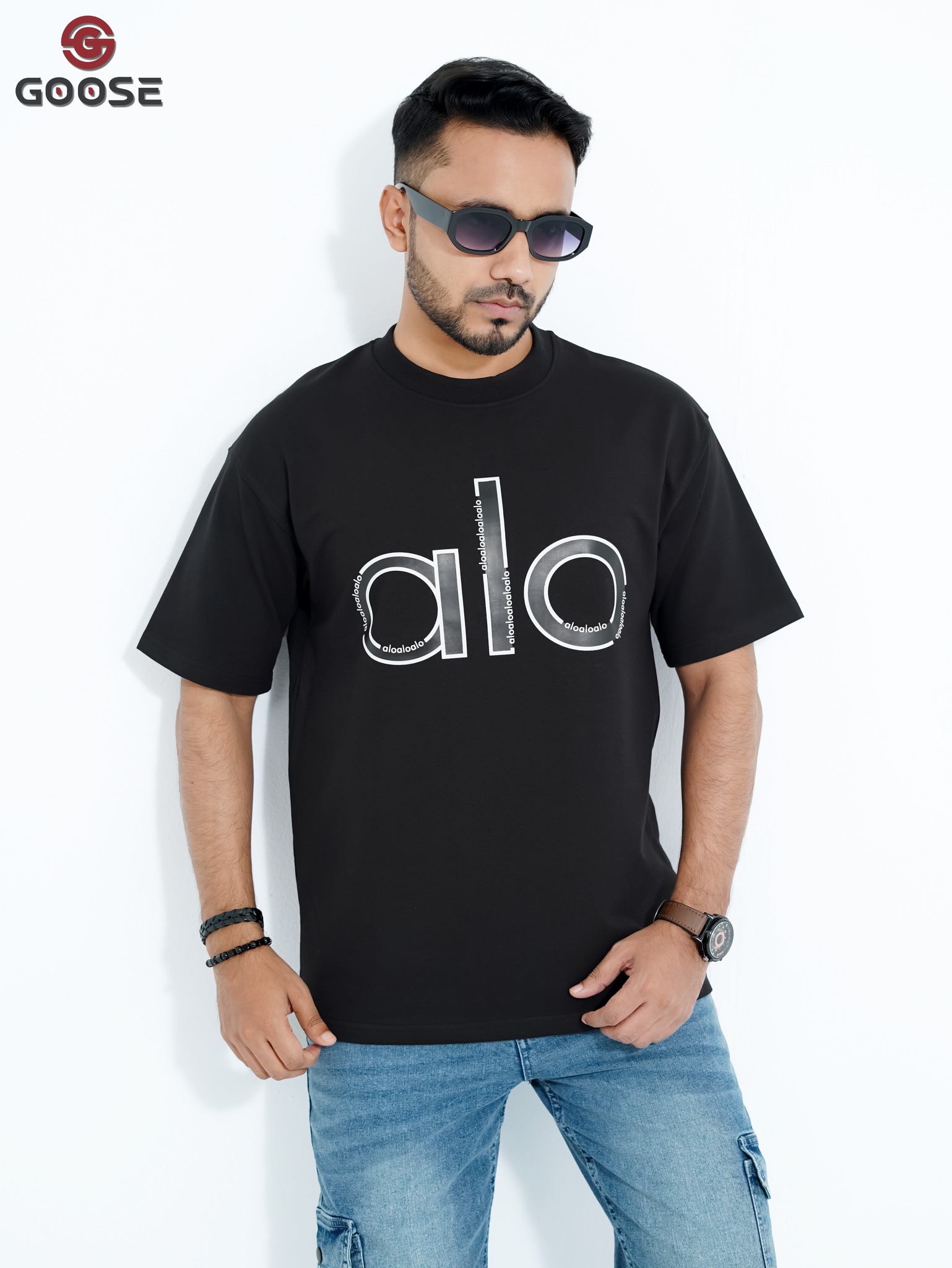 The clean white base is elevated with a sleek black graphic print on the front, creating a strong visual contrast that stands out effortlessly. The relaxed oversized fit with drop shoulder design ensures a trendy silhouette, perfect for casual outings, daily wear, or summer styling.