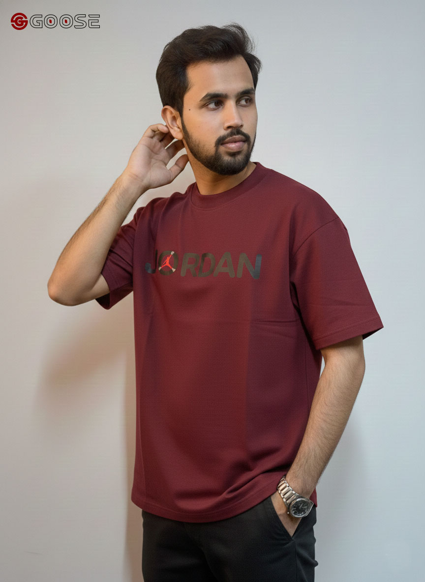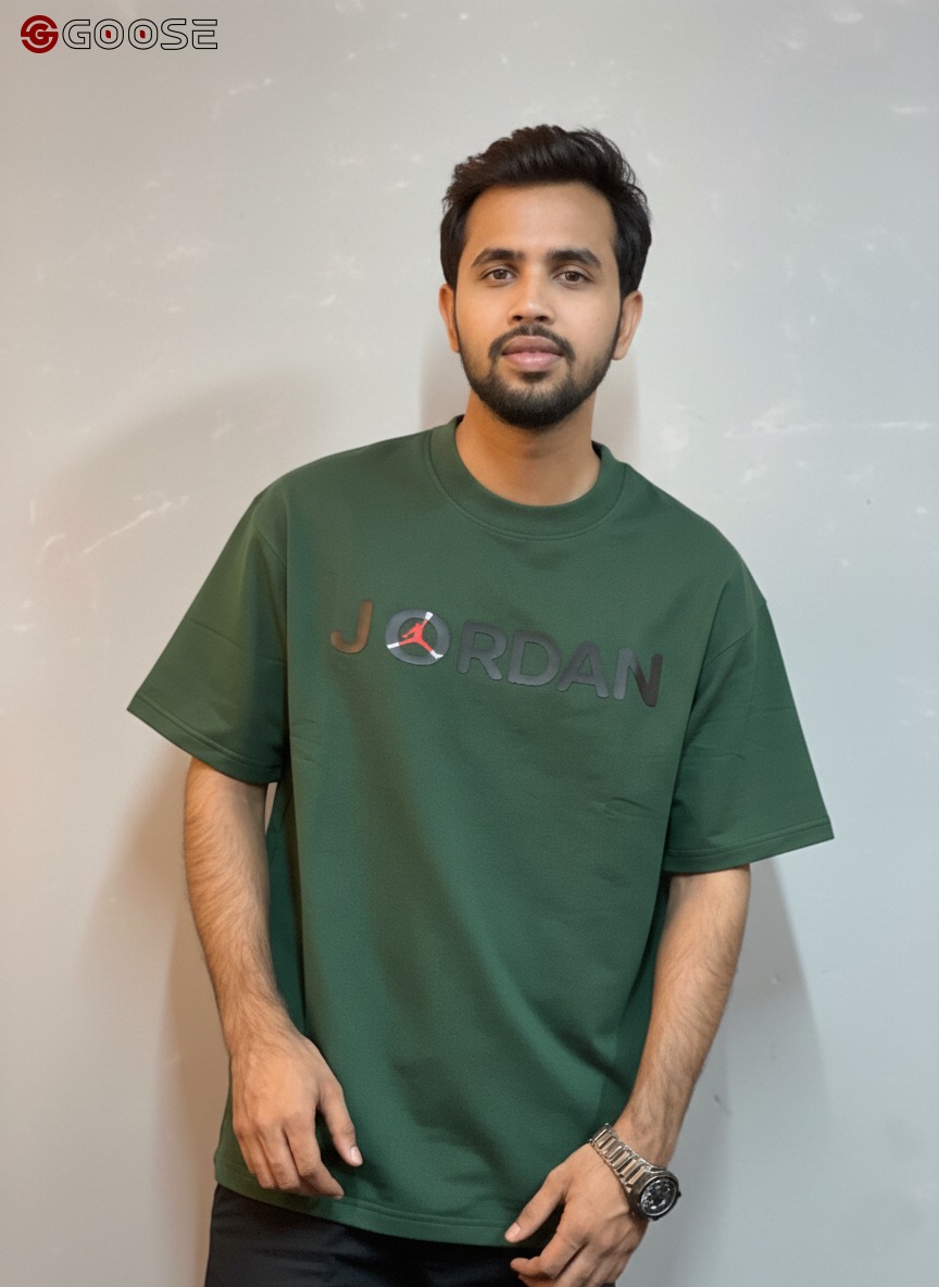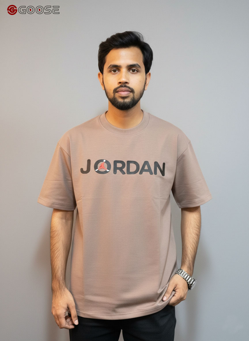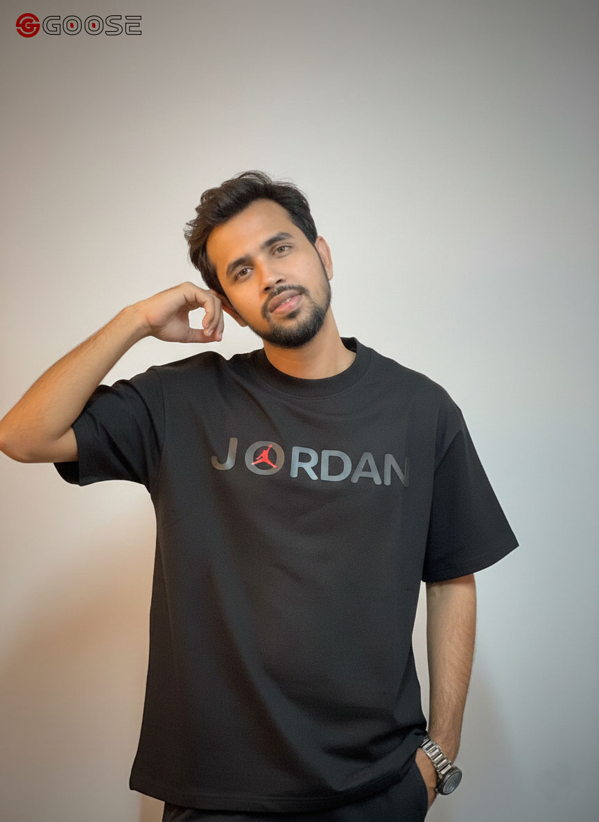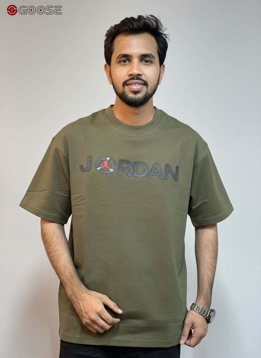 This premium heavy-weight cotton T-shirt blends a minimalist aesthetic with iconic sportswear heritage. Featuring a clean, optic-white finish, the shirt is anchored by a bold "JORDAN" wordmark across the chest, uniquely accented by a red Jumpman logo integrated into the lettering. Its contemporary, boxy silhouette includes dropped shoulders and structured half-sleeves, offering a relaxed fit that mirrors modern streetwear trends. Finished with a durable ribbed crew neck, this piece provides a high-quality, substantial feel that maintains its shape, making it an essential versatile staple for any casual wardrobe.