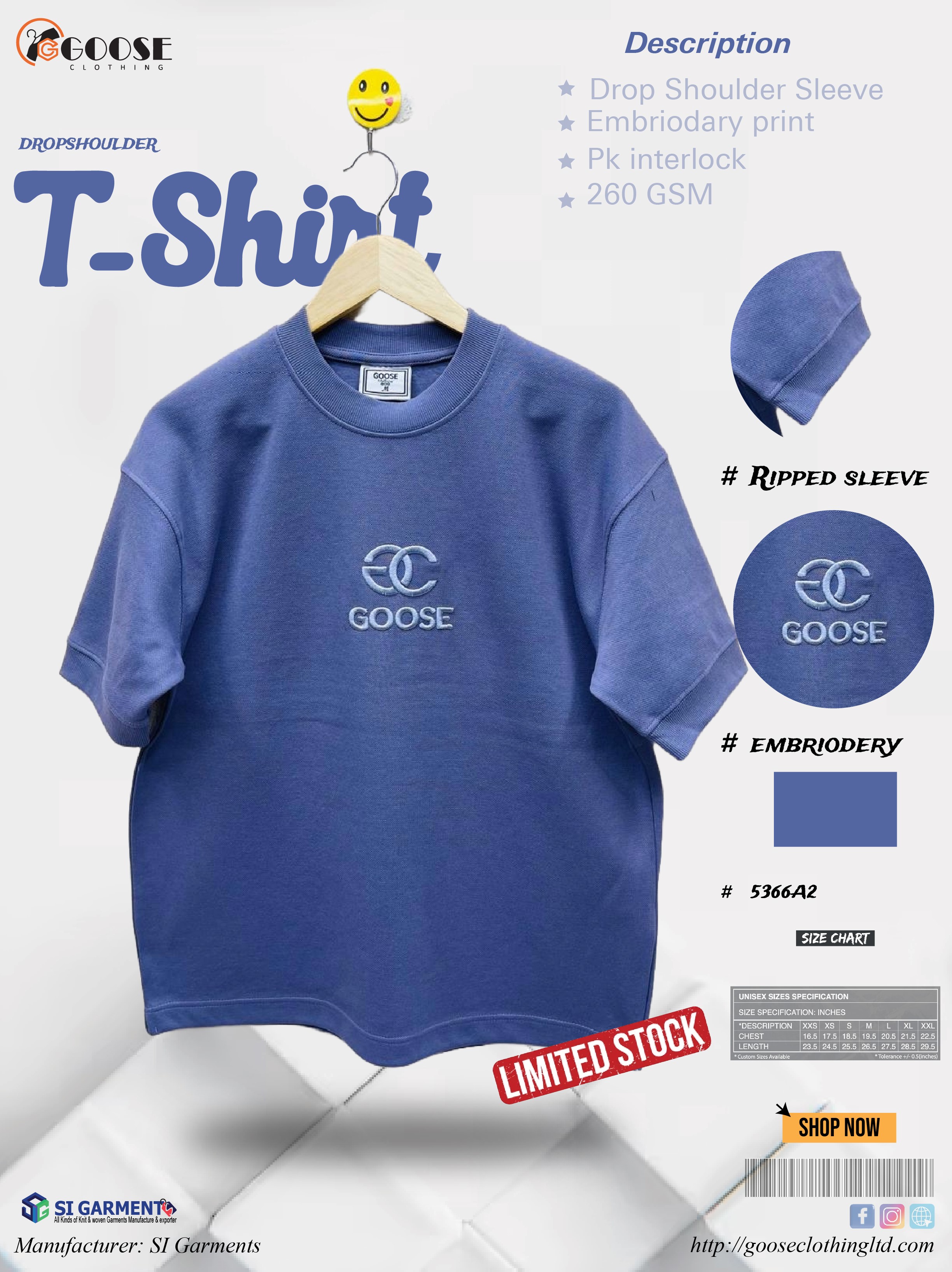 Design Details: Small embroidered GOOSE logo, Ripped Sleeve finish.
