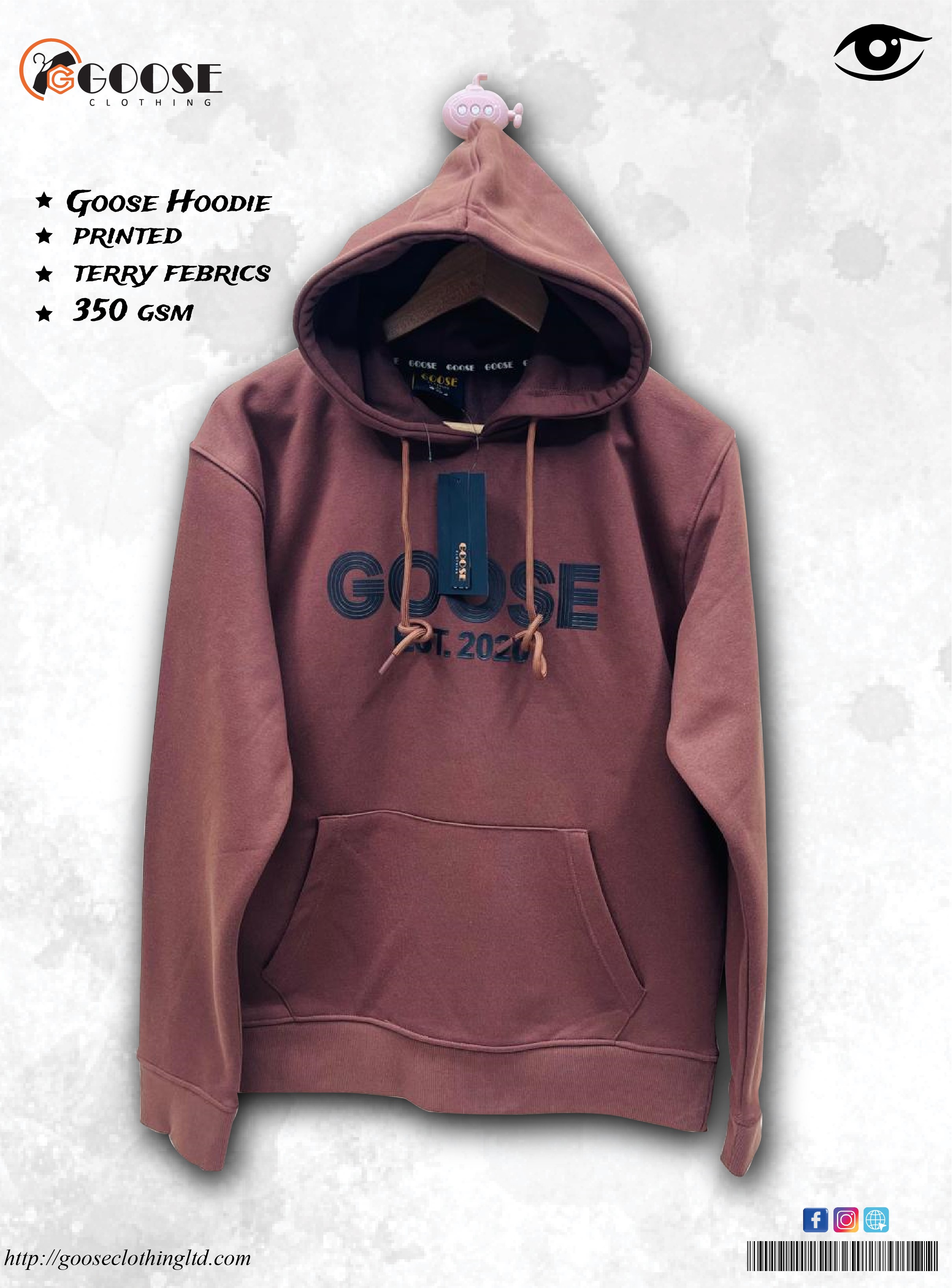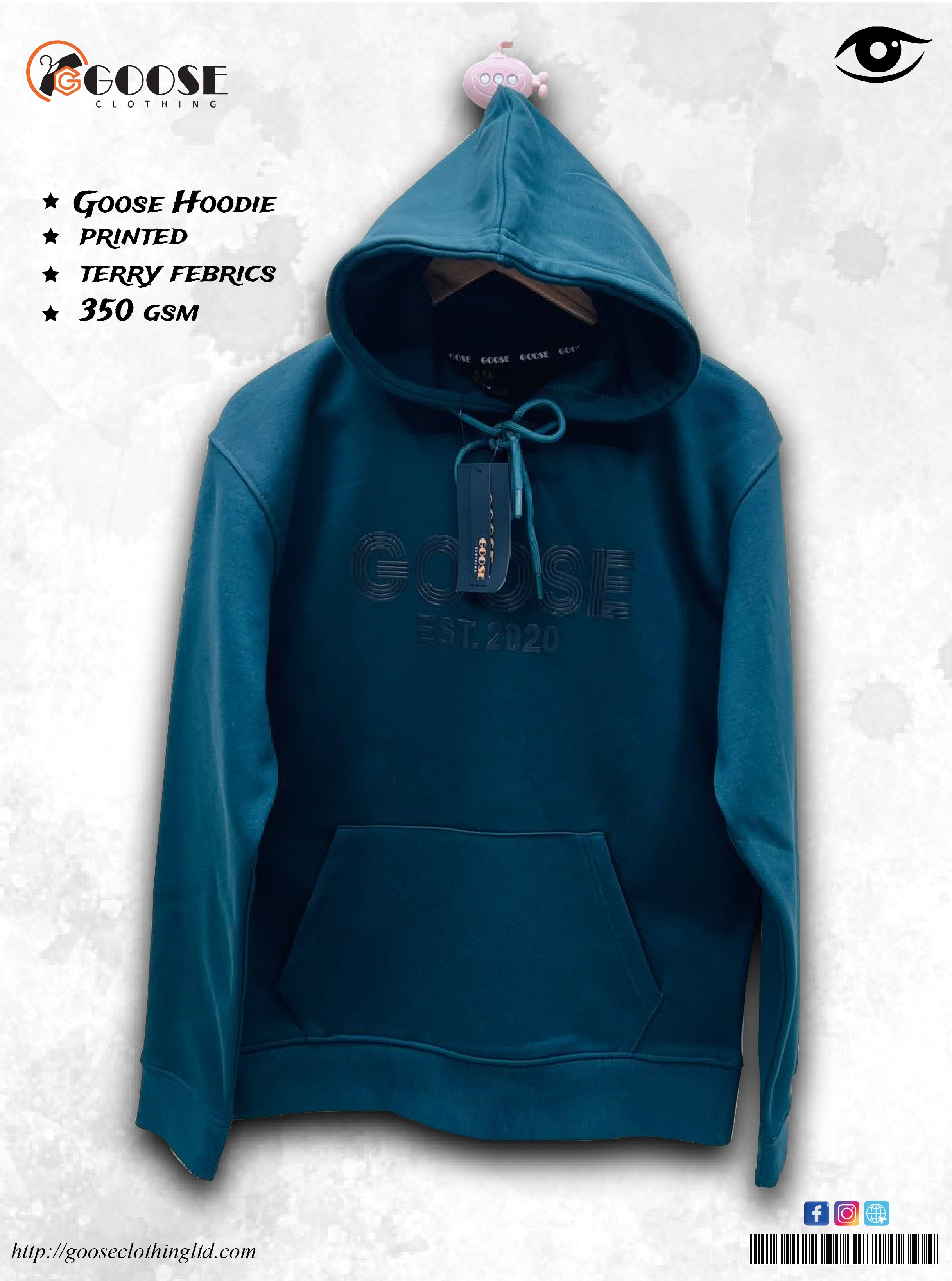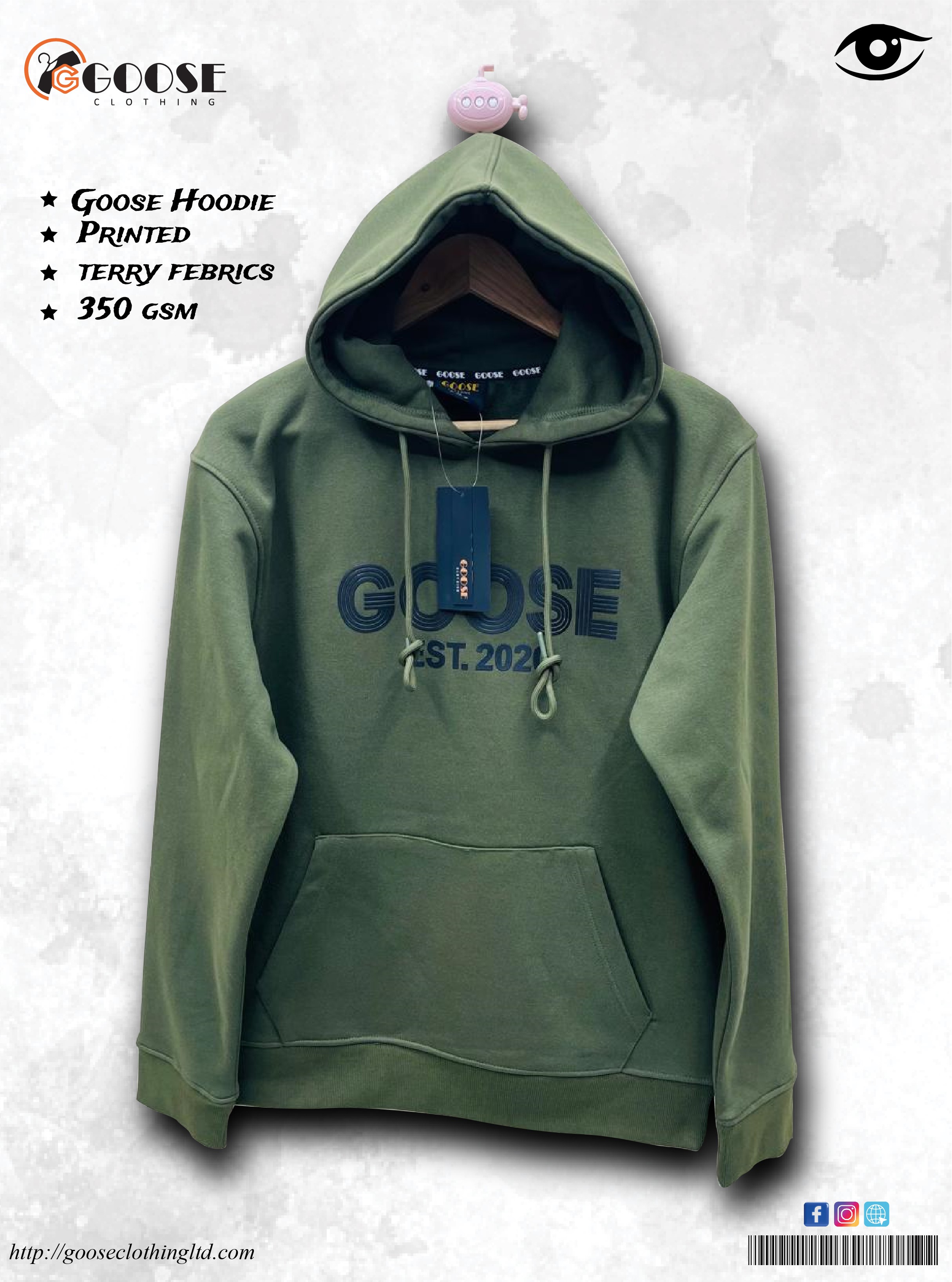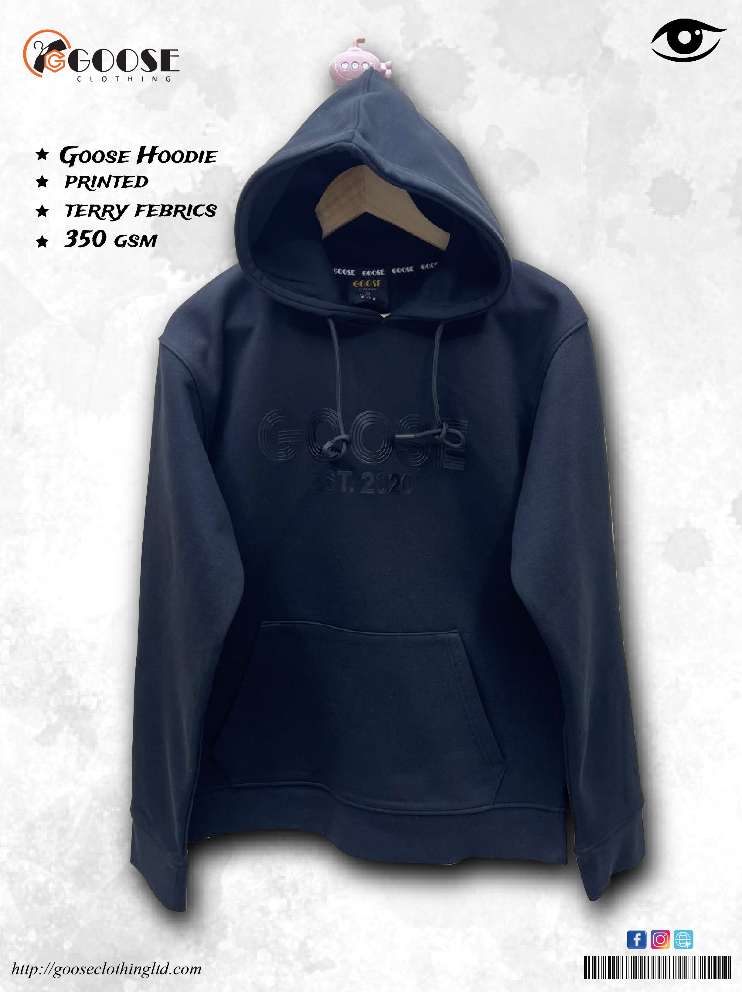 Design Details: Prominent "GOOSE EST. 2020" logo; Hooded, Kangaroo pocket.