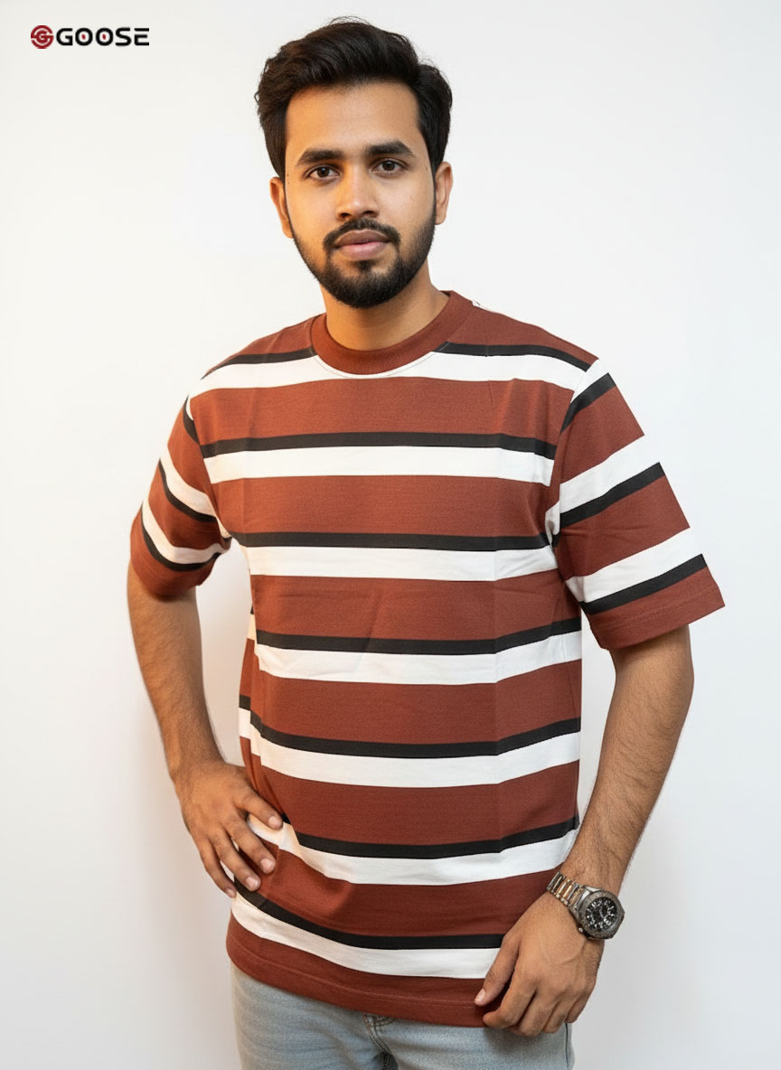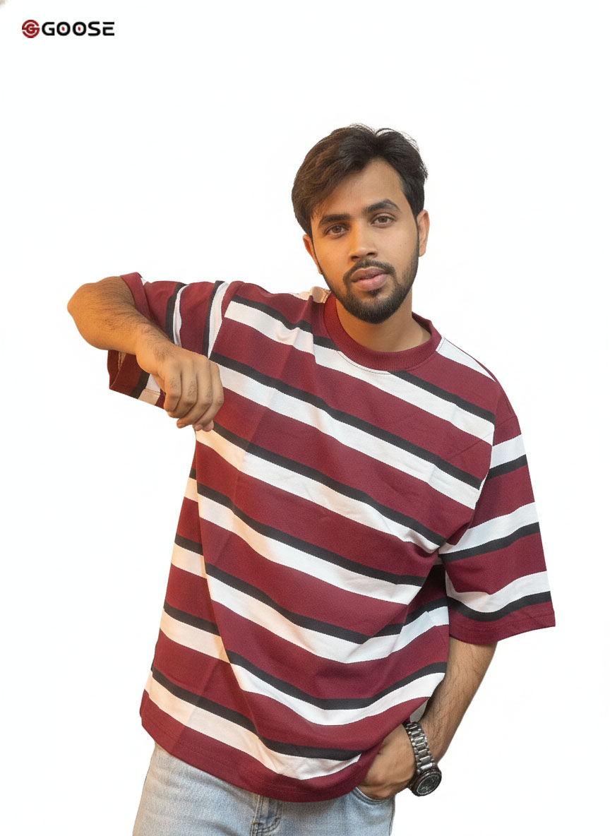 This is the GOOSE Cross Terry Step Drop Shoulder T-Shirt, featuring a bold maroon and white stripe design. It's crafted from Terry fabrics in a Drop Shoulder style for a relaxed, Regular Fit. Perfect for a comfortable and stylish Summer Collection look.
