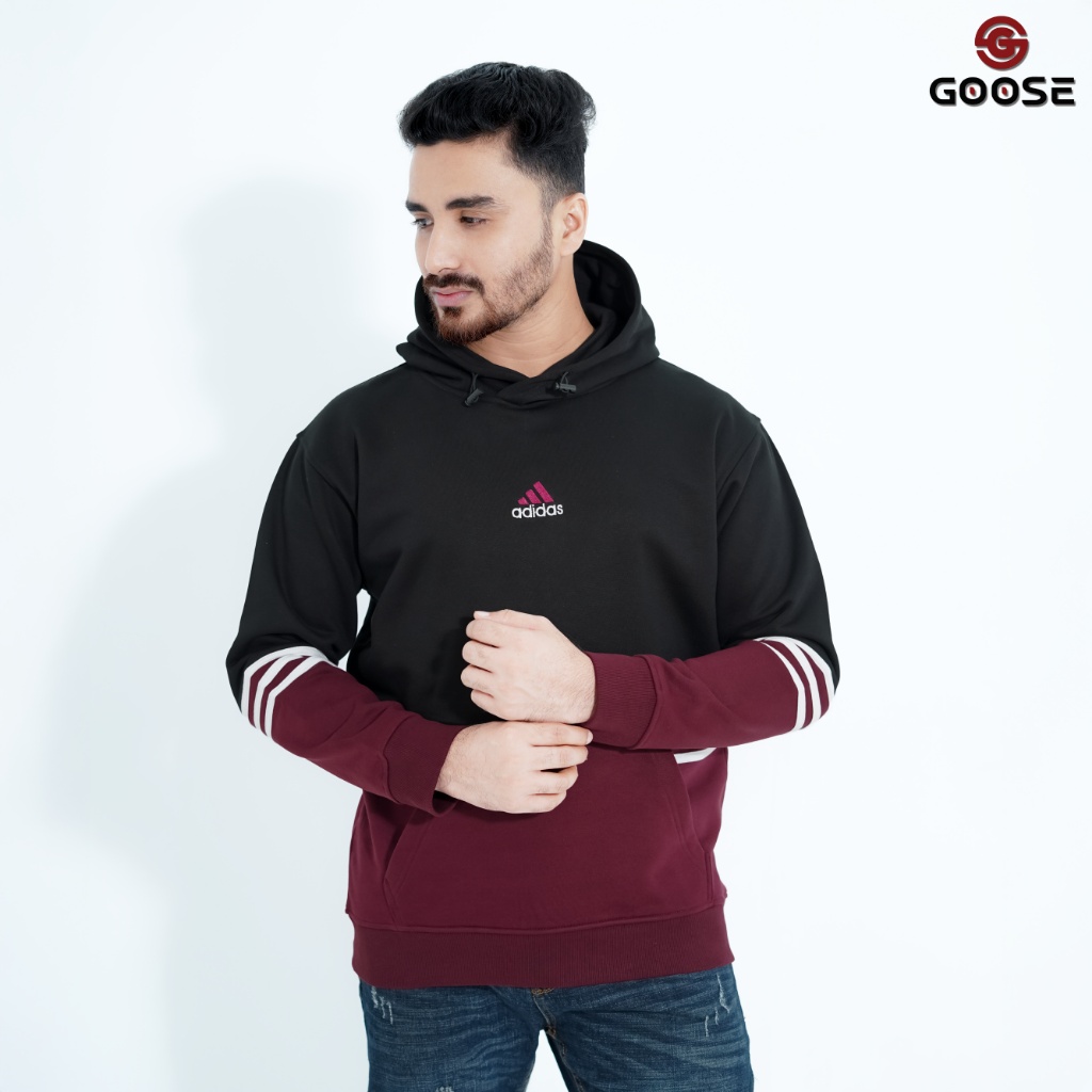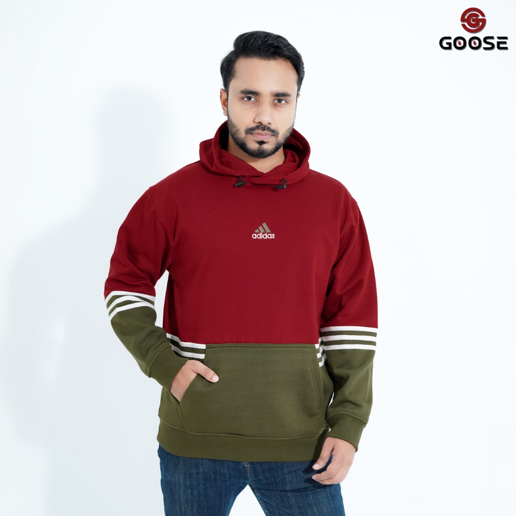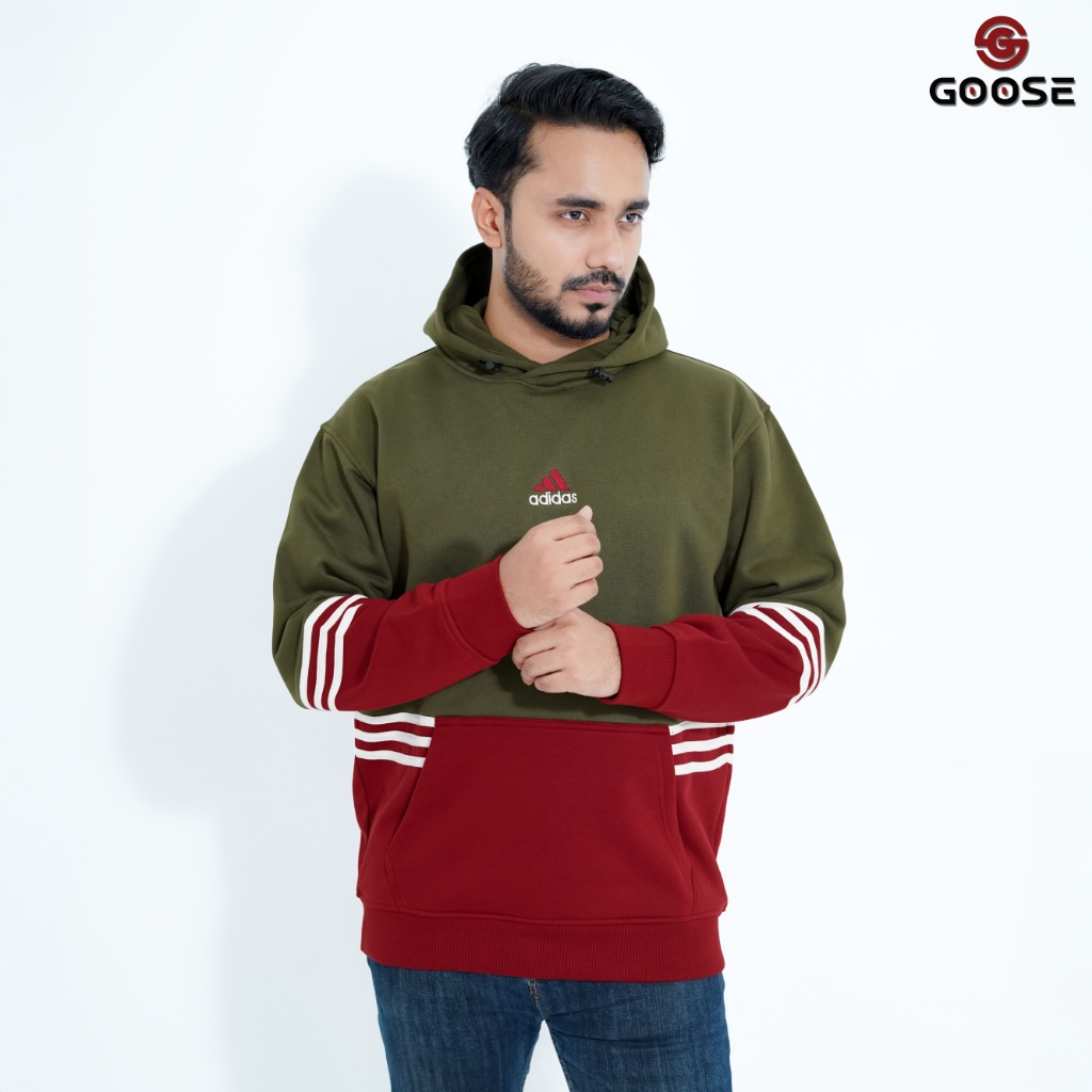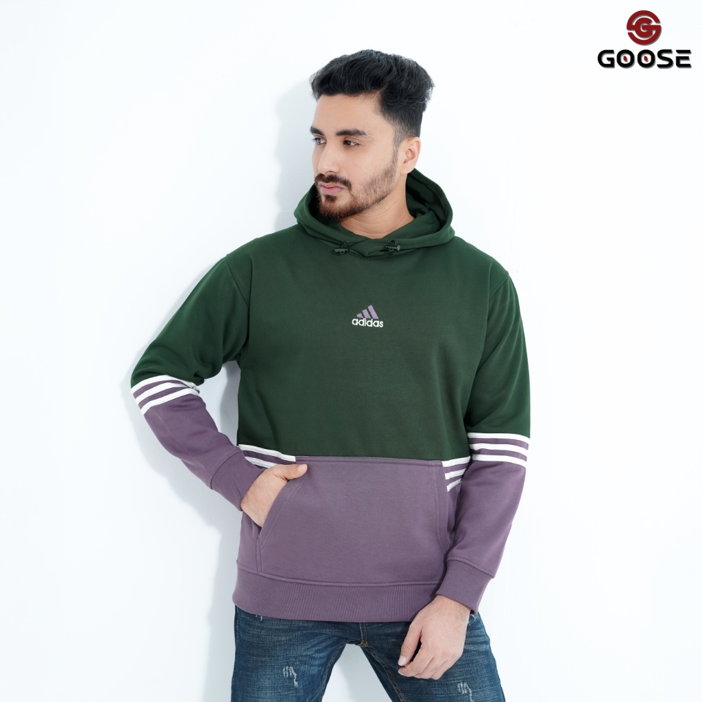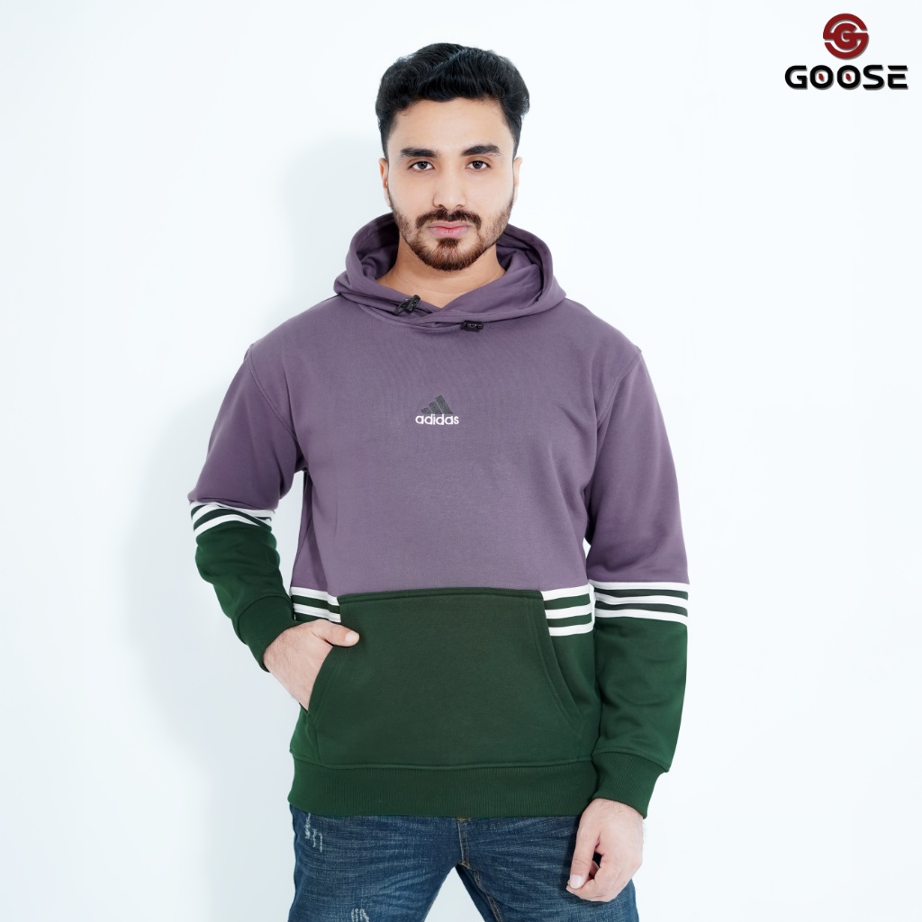 This is a modern, color-blocked Pullover Hoodie designed for a striking, contrasting look. The upper body and hood are a muted lilac or mauve color, while the lower body, including the generous front kangaroo pocket, is a deep forest green. The sleeves also feature the green color with a contrasting detail: bold triple white stripes encircling the cuff/forearm area, lending it a classic athletic or collegiate style. The chest features a small, subtle graphic—a stylized logo that resembles the adidas Trefoil logo with the word "adidas" below it, centered on the lilac panel. The overall aesthetic is a contemporary blend of streetwear color blocking and vintage sports influence. The 'GOOSE' branding, visible in the top corner of the image, appears to be the retailer or a secondary brand associated with the item's marketing.