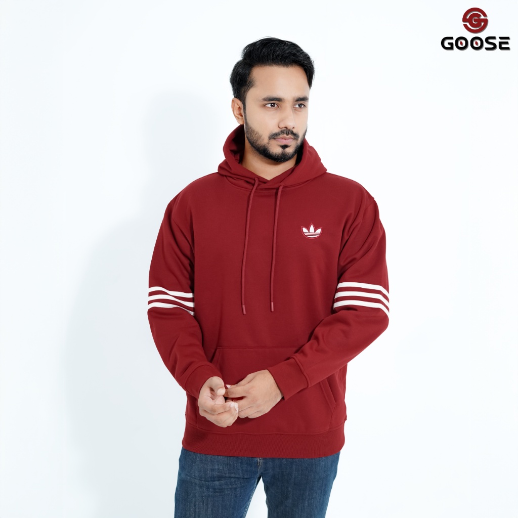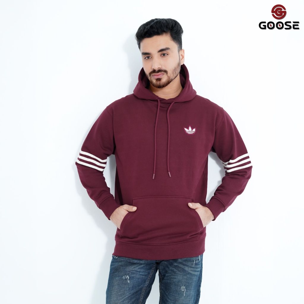 This is a sporty and comfortable Unisex Zip-Up Hoodie in a rich maroon or burgundy color. It features a modern, casual design with striking white accents in the form of double horizontal stripes running along the top of both sleeves, extending from the shoulder seam. The hoodie has a full front zip closure, a divided kangaroo pocket, and a drawstring hood. The front chest is clean, with the main graphic appearing on the back. The back design showcases a large, bold circular motif with the text "GOOSE" prominently placed above the smaller phrase "TRUST • QUALITY" and other decorative elements. This garment is ideal for casual wear, blending warmth, comfort, and a classic athletic-inspired style.