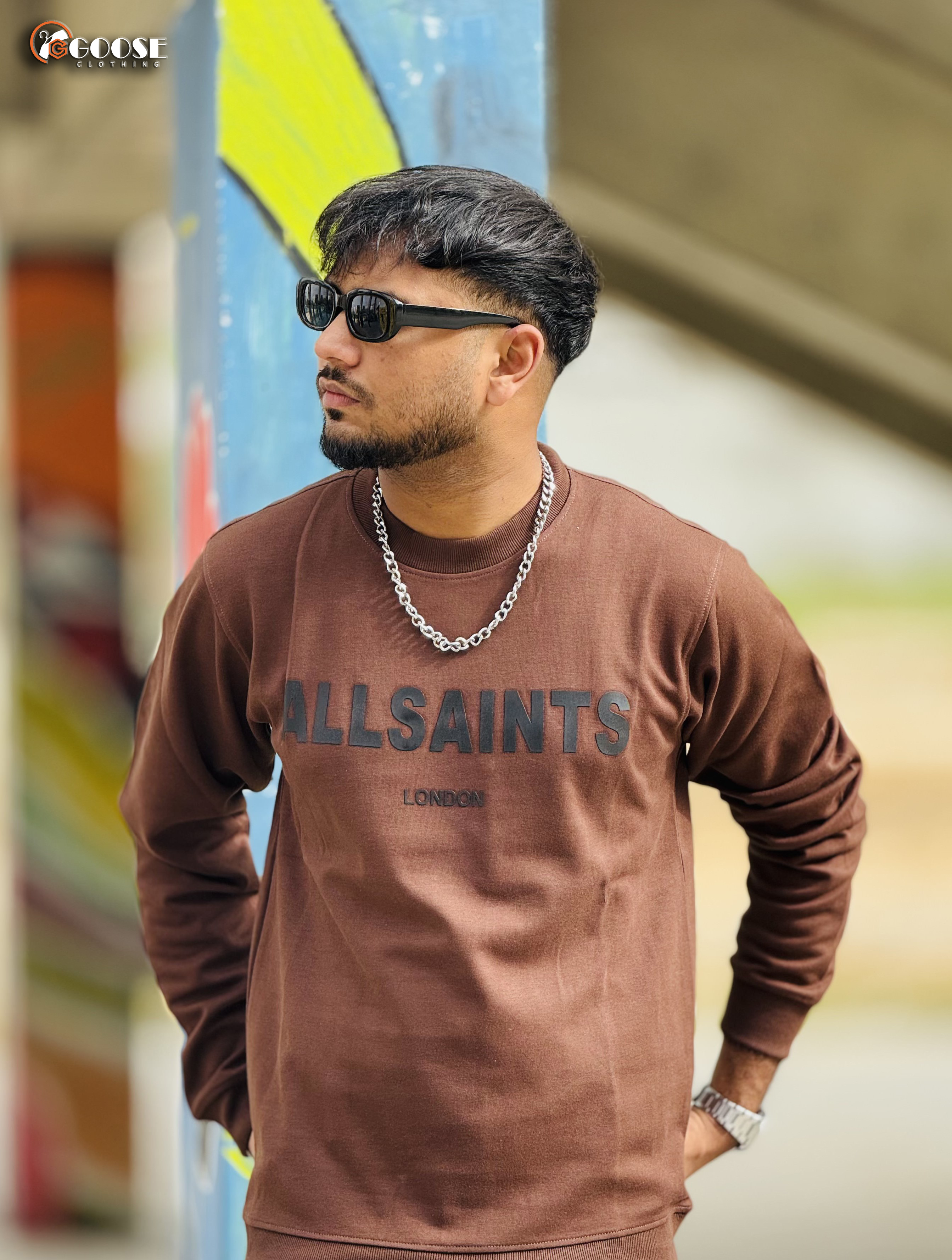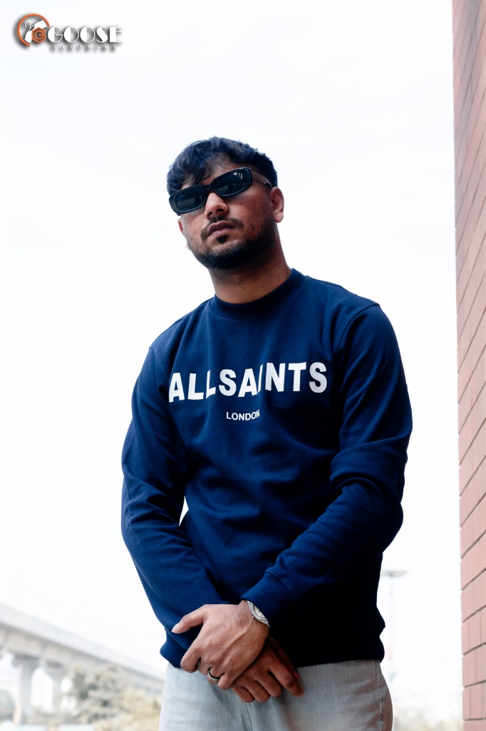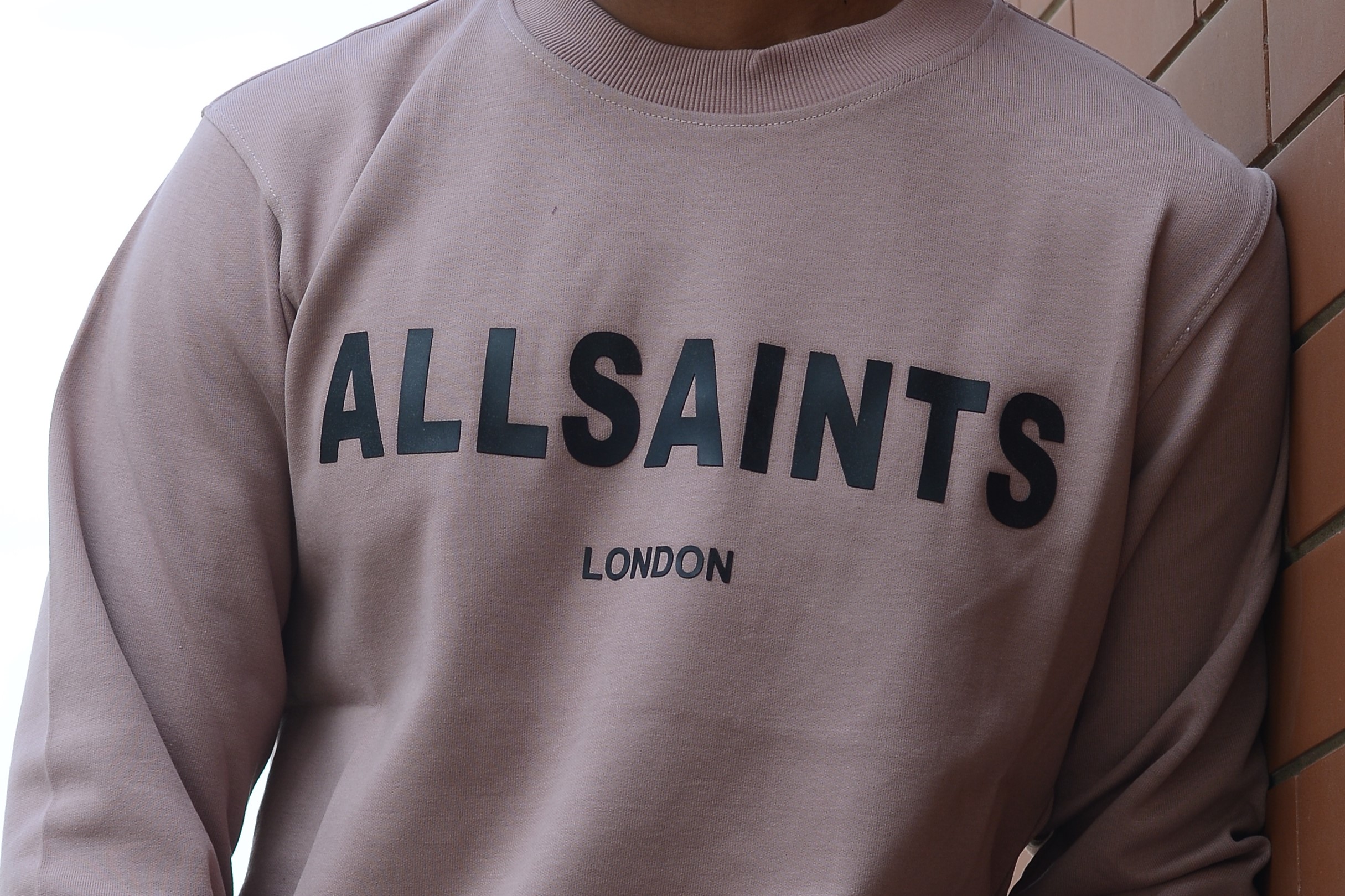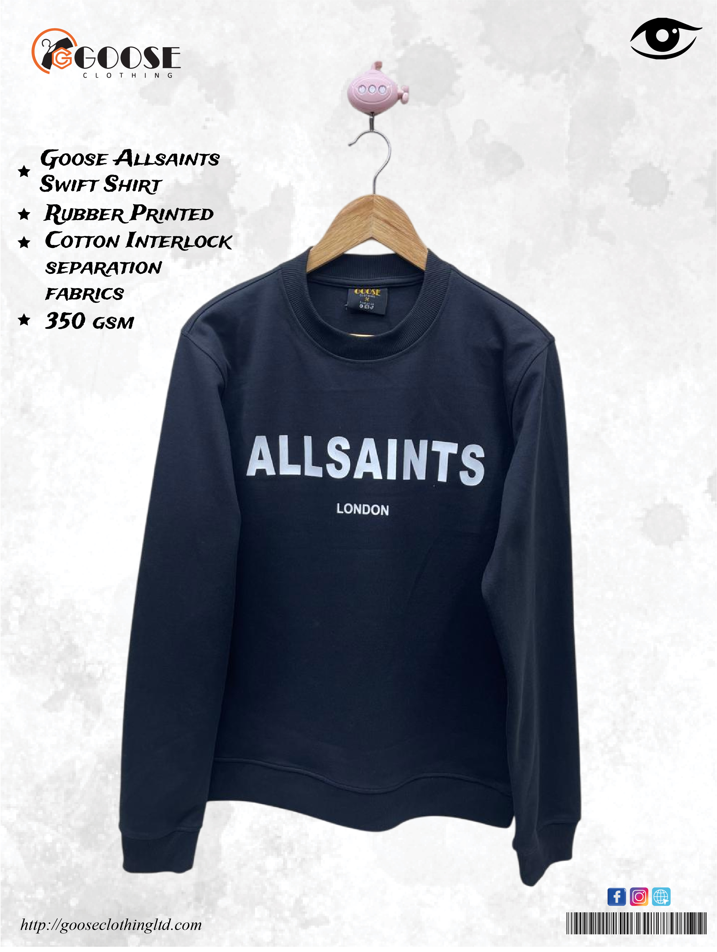 Elevate your casual style with the GOOSE AllSaints Swift Shirt in a deep, rich indigo/purple hue. This crewneck sweatshirt features a striking "ALLSAINTS LONDON" graphic, created using rubber printing for a bold, tactile finish.