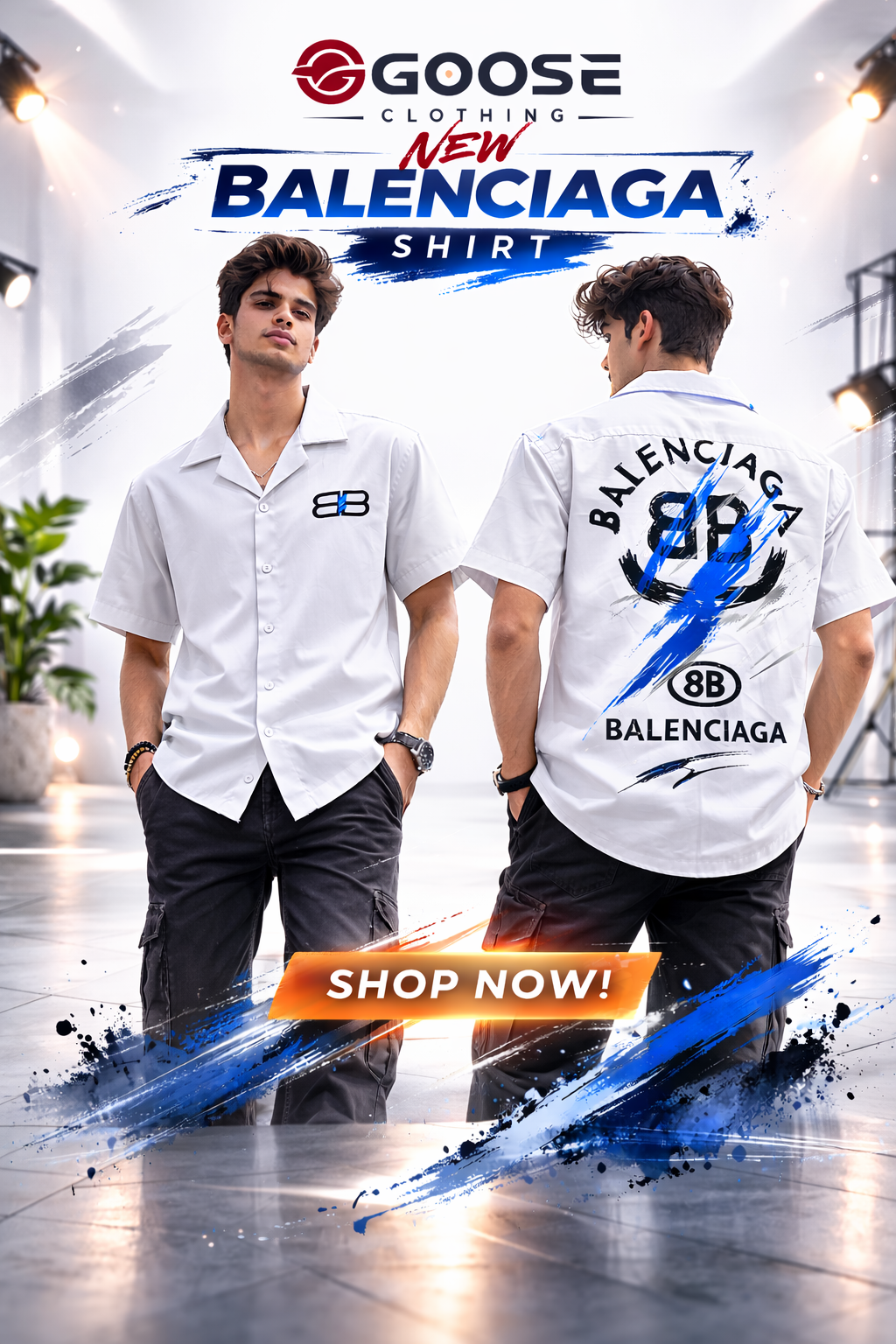 Elevate your style with the **Goose Clothing New Balenciaga Shirt**. This crisp white, short-sleeved collared shirt features a distinctive "BB" logo on the front left chest. The back showcases a bold "BALENCIAGA" inscription with an eye-catching blue brushstroke design and the iconic "BB" emblem. Perfect for a modern, sophisticated look. Shop now to add this statement piece to your wardrobe!