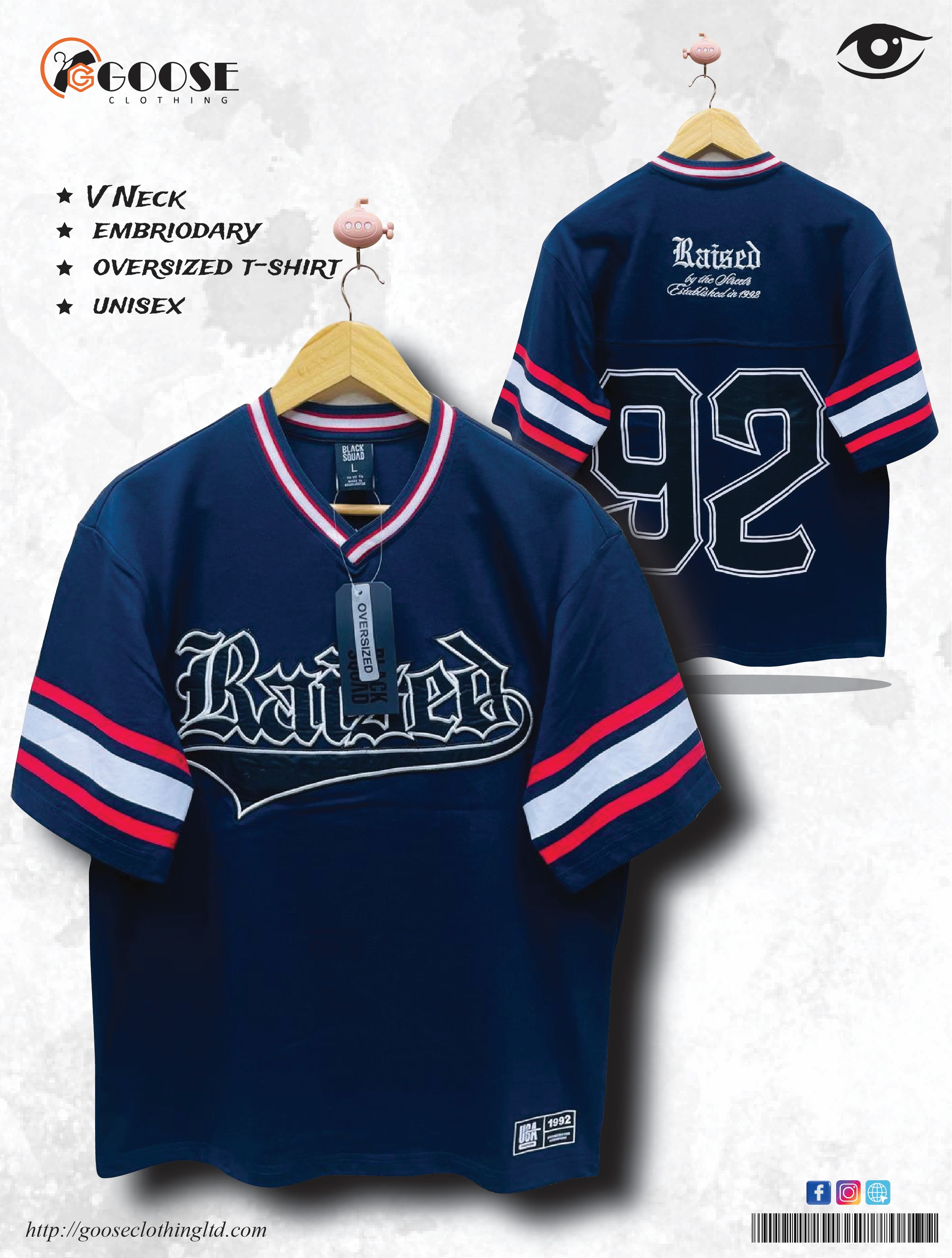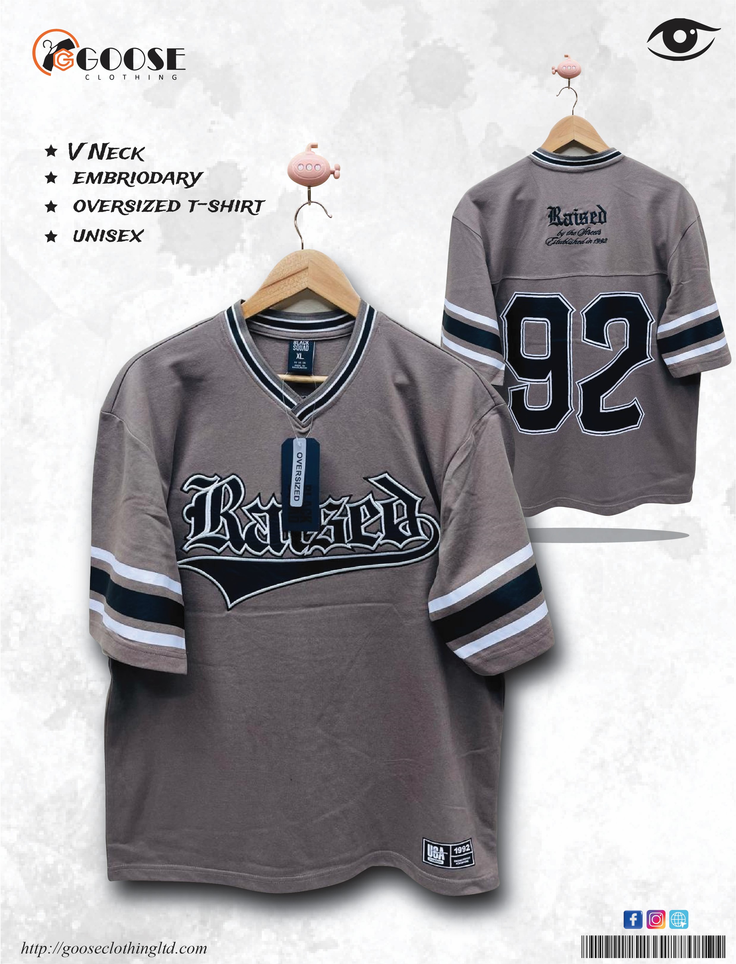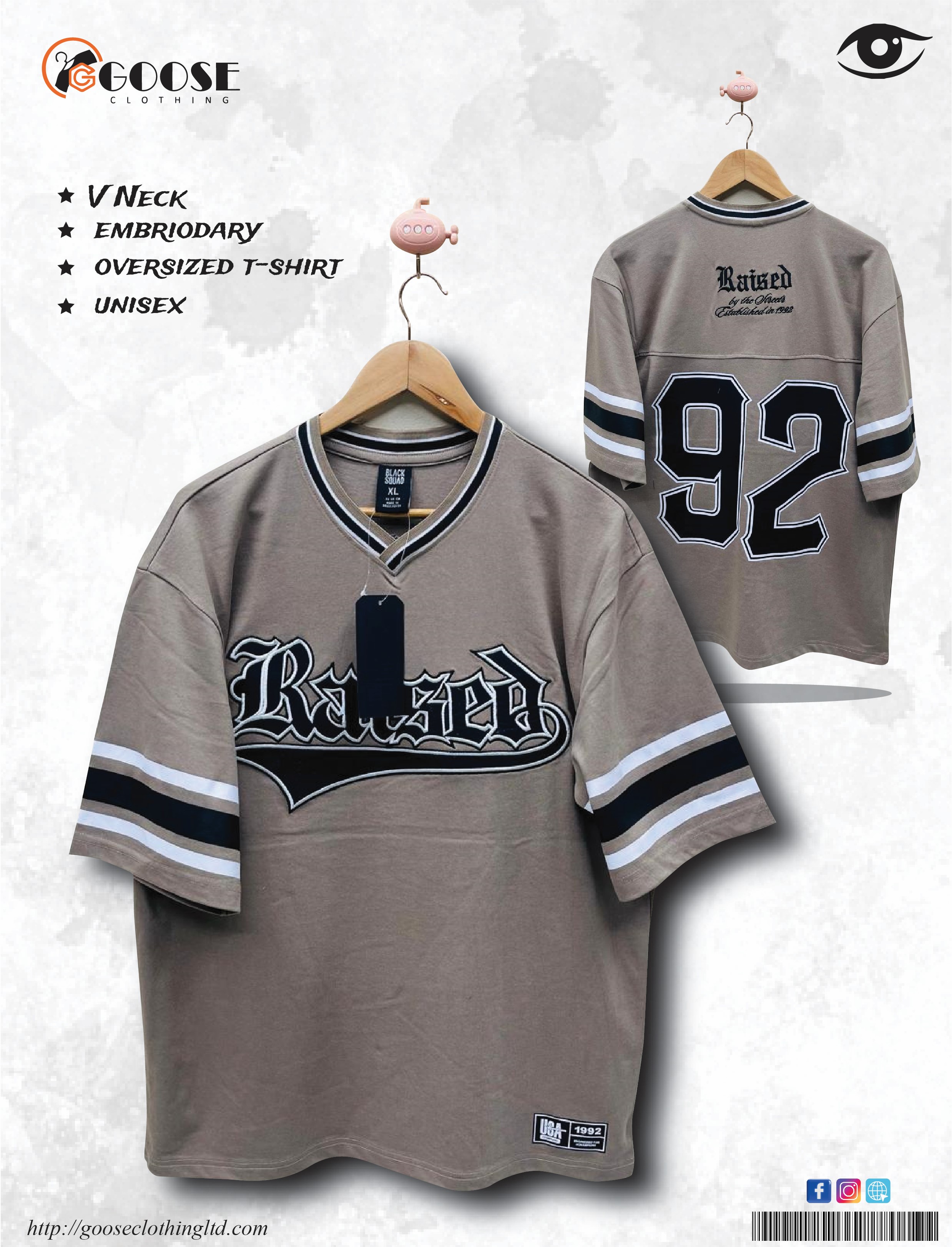 This is a UNISEX Oversized T-Shirt from GOOSE CLOTHING styled after an American sports jersey, presented in a muted Taupe/Muted Brown-Grey color. The shirt features a V-Neck with contrast ribbed trim and wide, striped sleeve accents. The front chest features bold "Raised" lettering applied using EMBROIDARY. The back reinforces the athletic theme with a large printed number "92" and additional graphic text, giving the garment a retro, streetwear aesthetic.