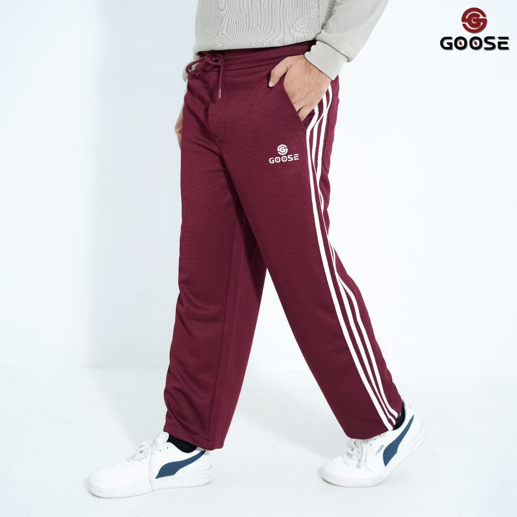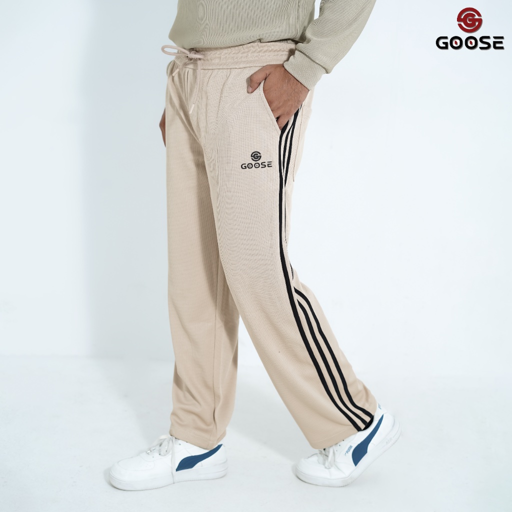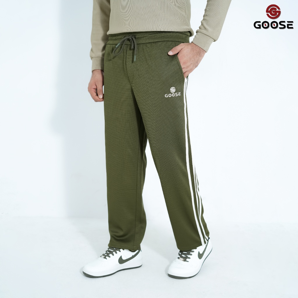 These men's track pants blend comfort with a refined casual look, presented in a versatile olive green or khaki color which features a subtle micro-texture or checkered pattern. They offer a relaxed, straight-leg fit, making them ideal for everyday wear. The design is accented by two striking dark contrast stripes running down the outside of each leg, maintaining a classic athletic aesthetic. The pants include a functional elasticized waist with an adjustable drawstring and convenient side pockets. Finished with the "GOOSE" brand logo embroidered on the left thigh, these track pants pair easily with neutral tops and sneakers, offering a stylish and comfortable option for various casual occasions.