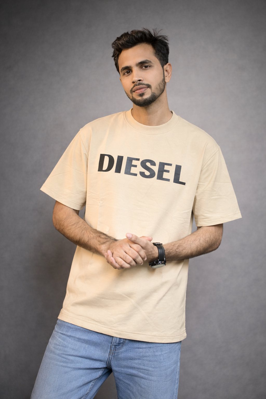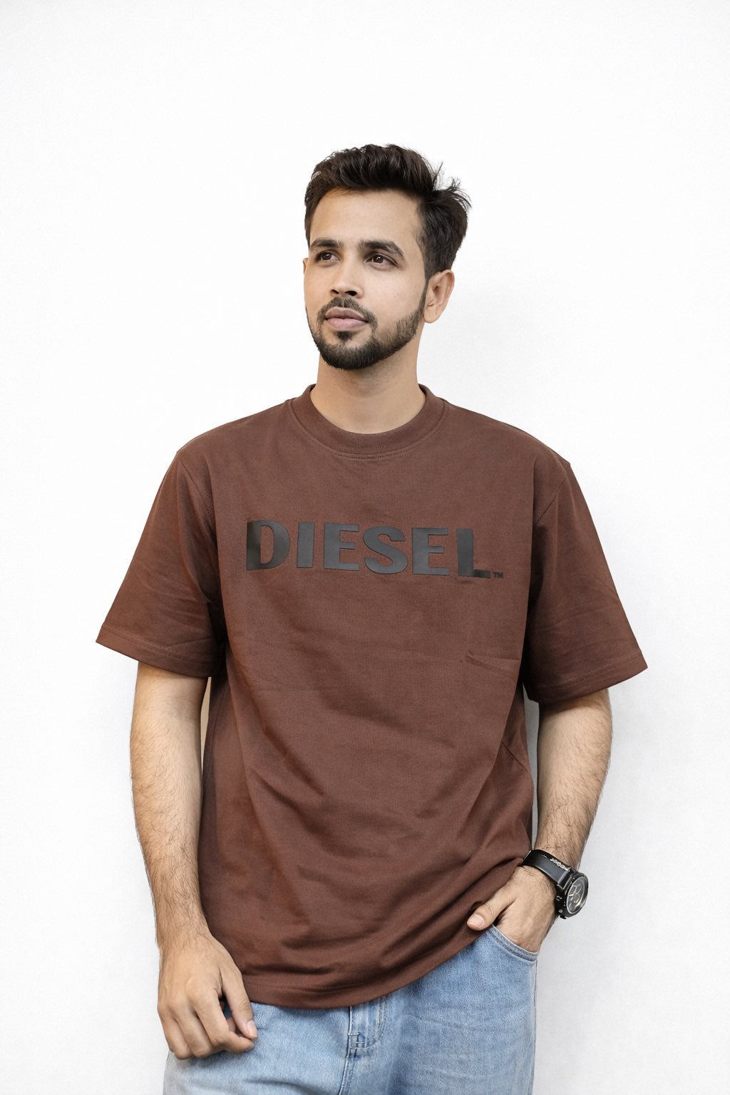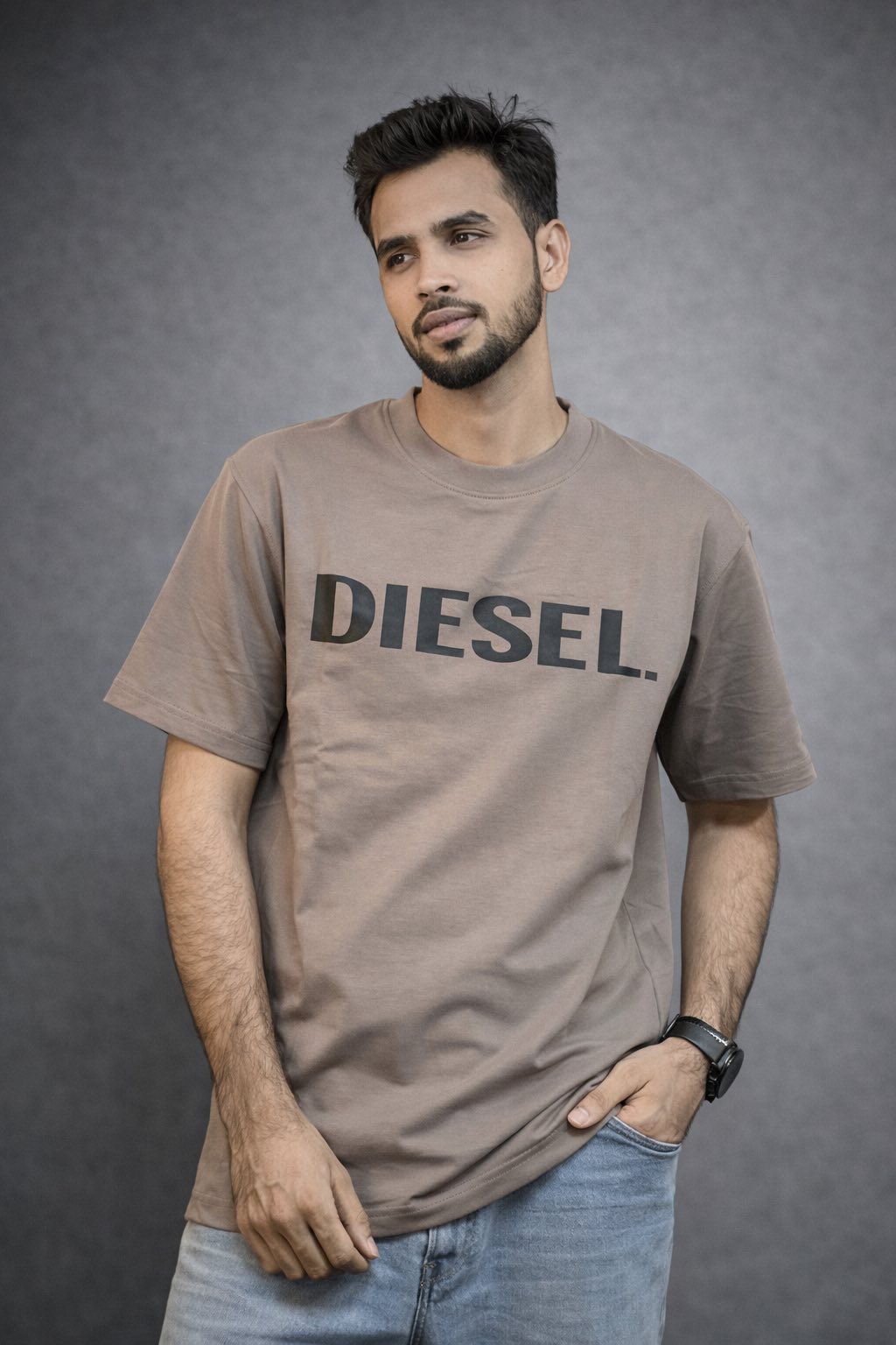 The bold front typography adds a strong, minimalist statement, while the earthy tone enhances its versatile appeal—easy to pair with denim or layered looks. Styled here with black jeans and subtle accessories, the look reflects a clean, contemporary aesthetic suitable for today’s fashion-forward audience.
