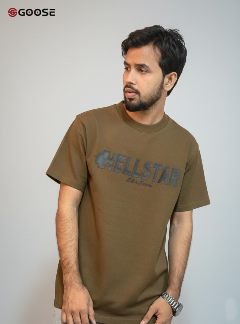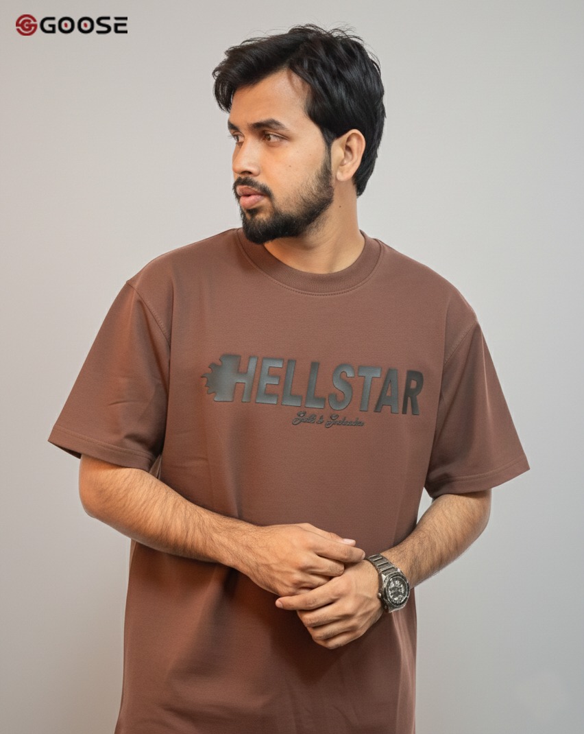 This lifestyle T-shirt is crafted in a rich, earthy rust-orange hue, offering a warm and versatile addition to any streetwear collection. The chest features a prominent, rectangular black graphic that houses high-contrast branding, including the iconic Jumpman logo, "HELLSTAR" typography, and the Hellstar swoosh for a heritage-inspired look. Designed with a modern, oversized aesthetic, the shirt boasts a relaxed boxy fit, dropped shoulders, and wide half-sleeves that prioritize both comfort and style. A thick, ribbed crew neck ensures the garment retains its structure, while the premium fabric provides a soft yet substantial feel suitable for year-round wear.