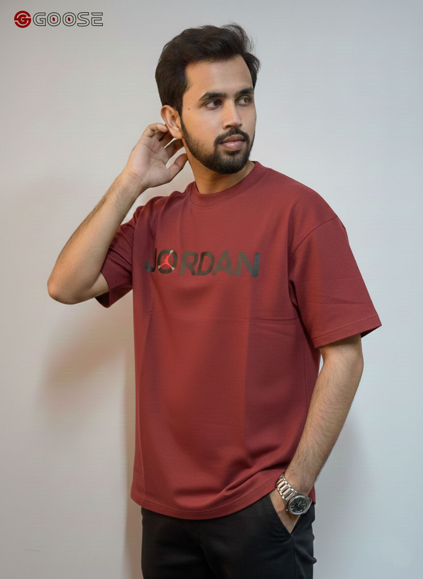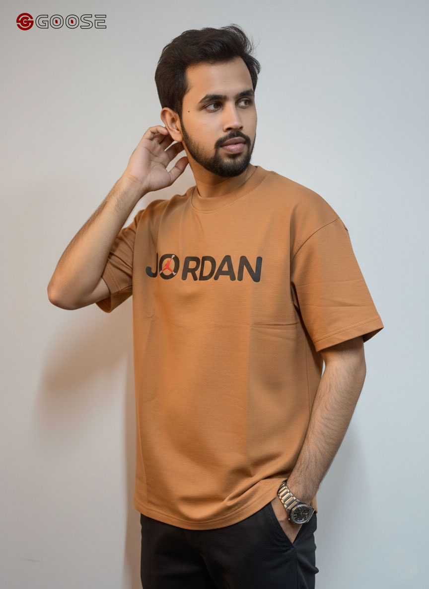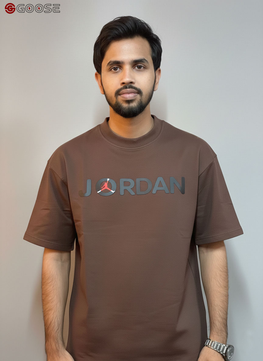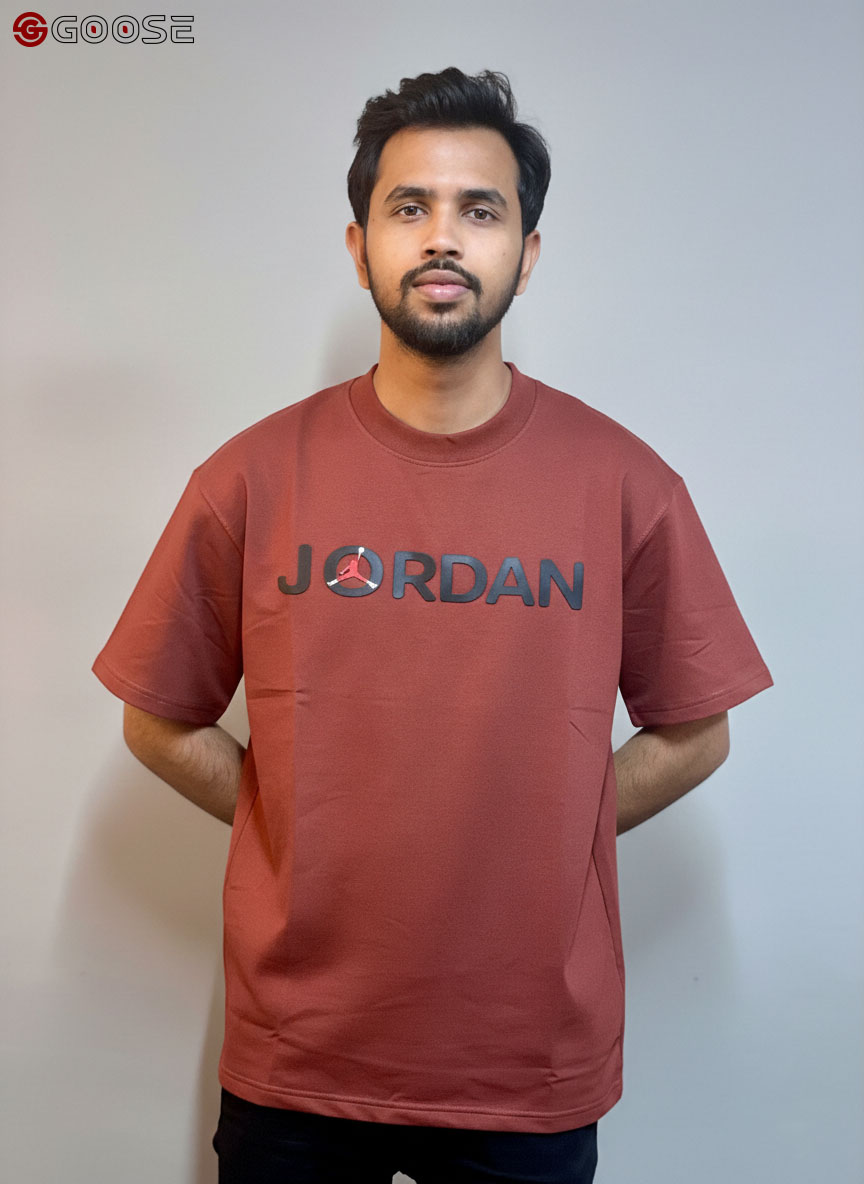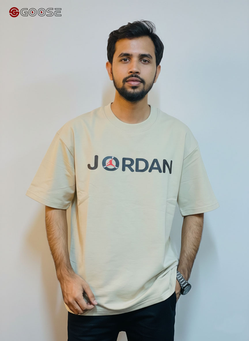 This premium heavy-weight cotton T-shirt blends a minimalist aesthetic with iconic sportswear heritage. Featuring a clean, optic-white finish, the shirt is anchored by a bold "JORDAN" wordmark across the chest, uniquely accented by a red Jumpman logo integrated into the lettering. Its contemporary, boxy silhouette includes dropped shoulders and structured half-sleeves, offering a relaxed fit that mirrors modern streetwear trends. Finished with a durable ribbed crew neck, this piece provides a high-quality, substantial feel that maintains its shape, making it an essential versatile staple for any casual wardrobe.