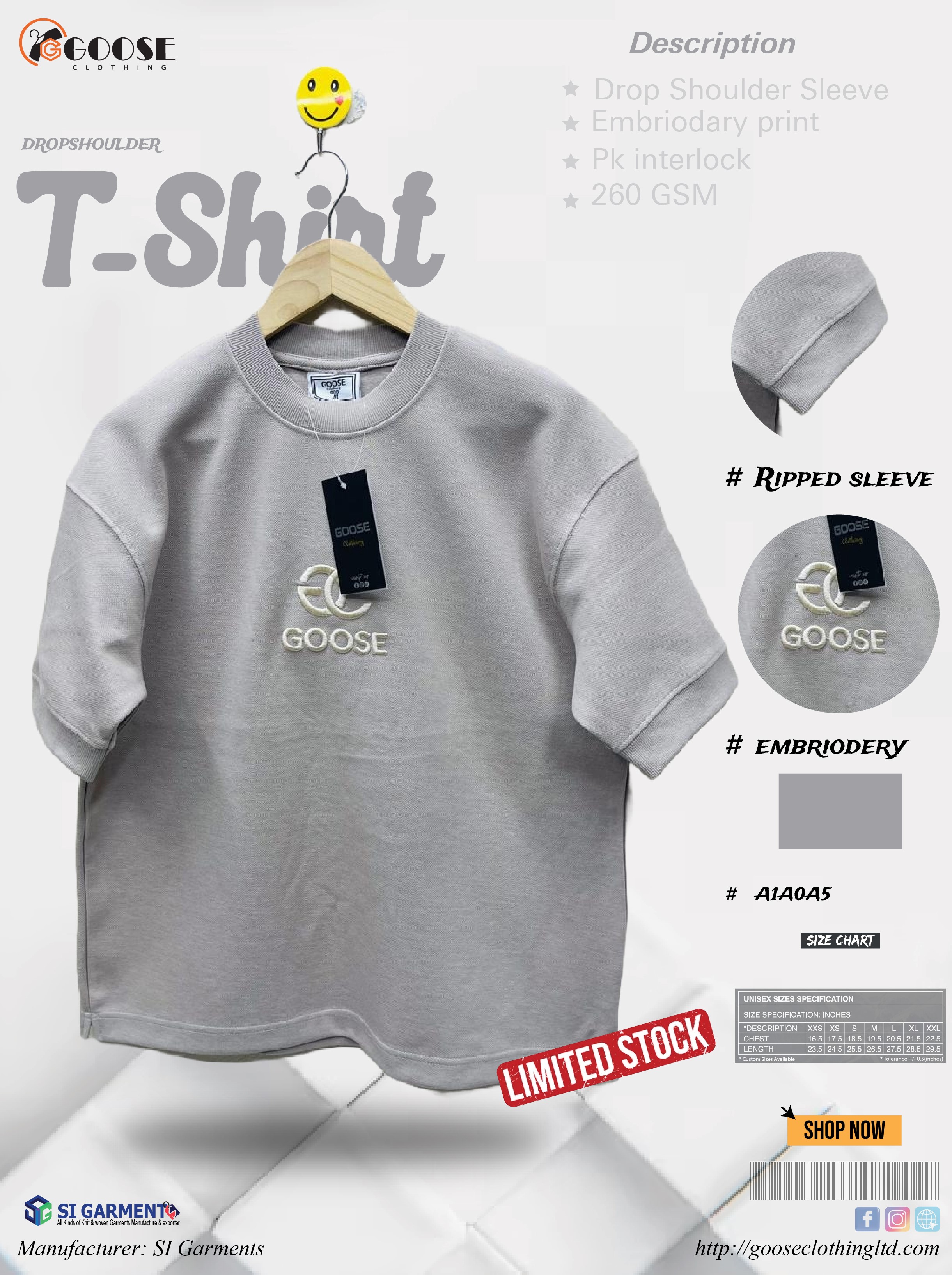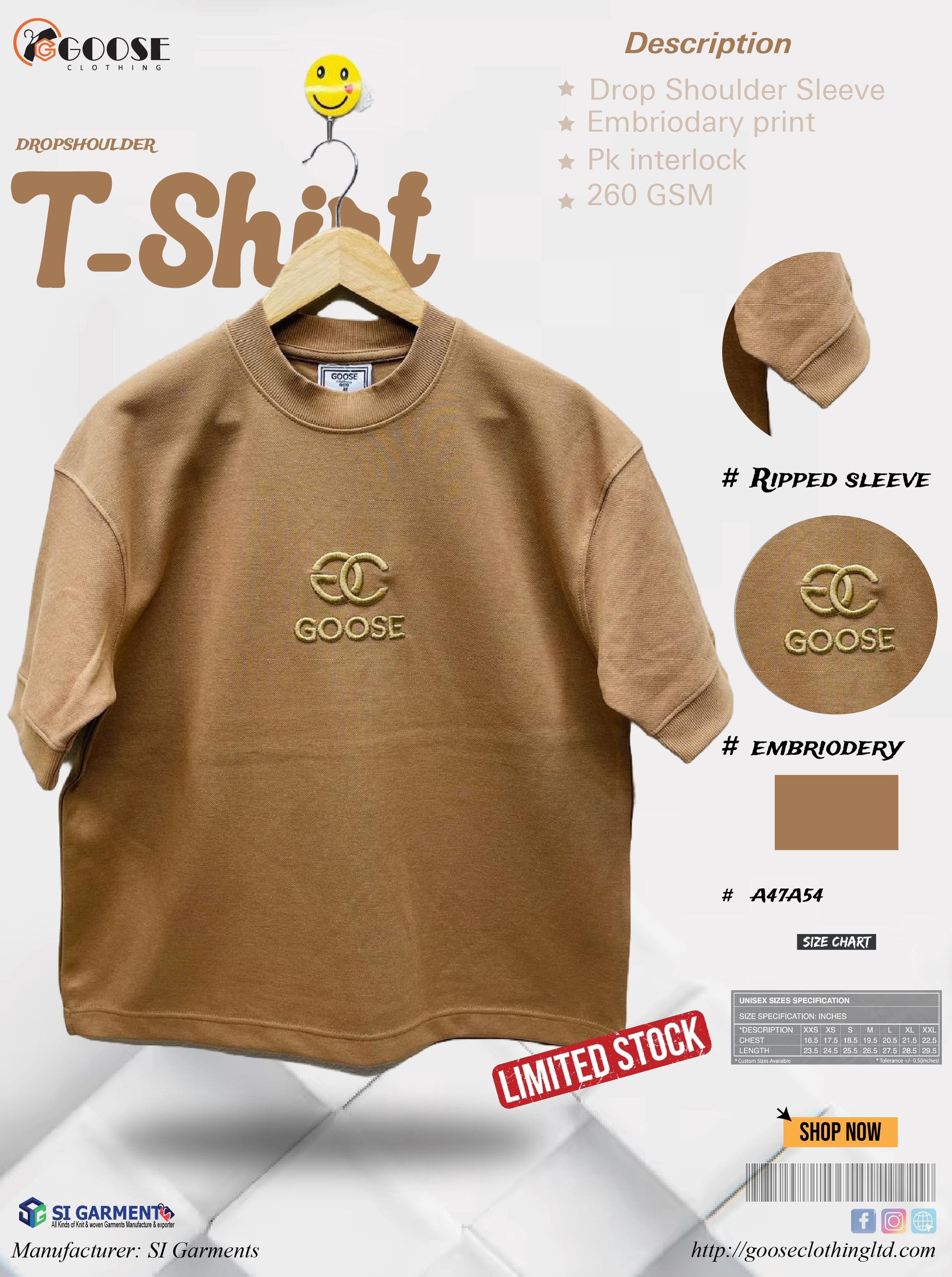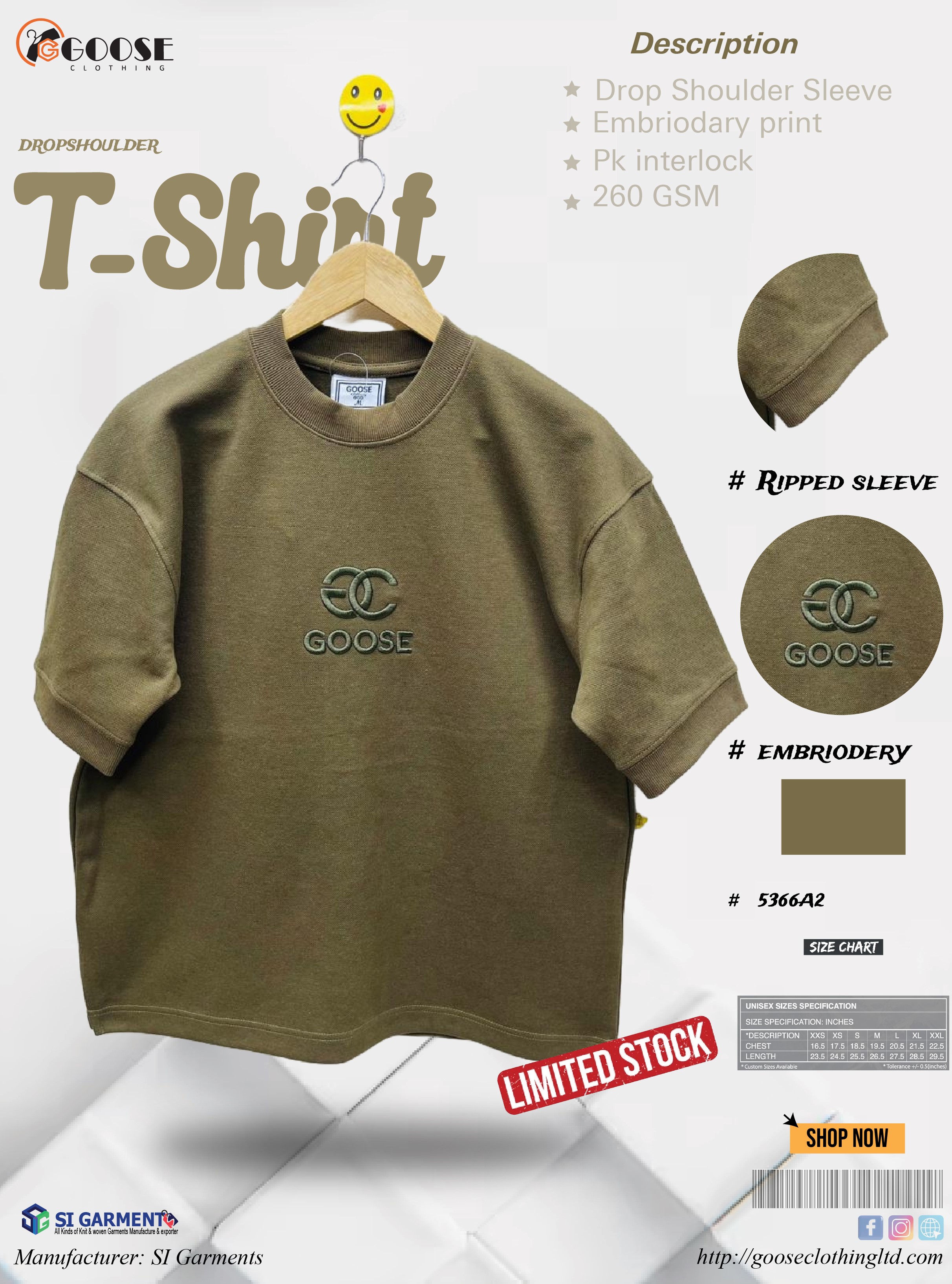 This is a heavy-weight Drop-Shoulder T-Shirt from GOOSE CLOTHING, featuring a rich Olive or Khaki color (code 5366A2) and premium details. The shirt is constructed from 260 GSM Pk Interlock fabric, which is a medium-heavy, double-knit material known for its smooth surface, excellent drape, and durability. The main branding is a small, embroidered GOOSE logo on the chest, a feature often used in high-end casual wear. A unique finishing touch is the Ripped Sleeve detail, which provides an enhanced, textured cuff. This limited-stock item combines a relaxed, drop-shoulder fit with high-quality material and subtle, sophisticated branding.