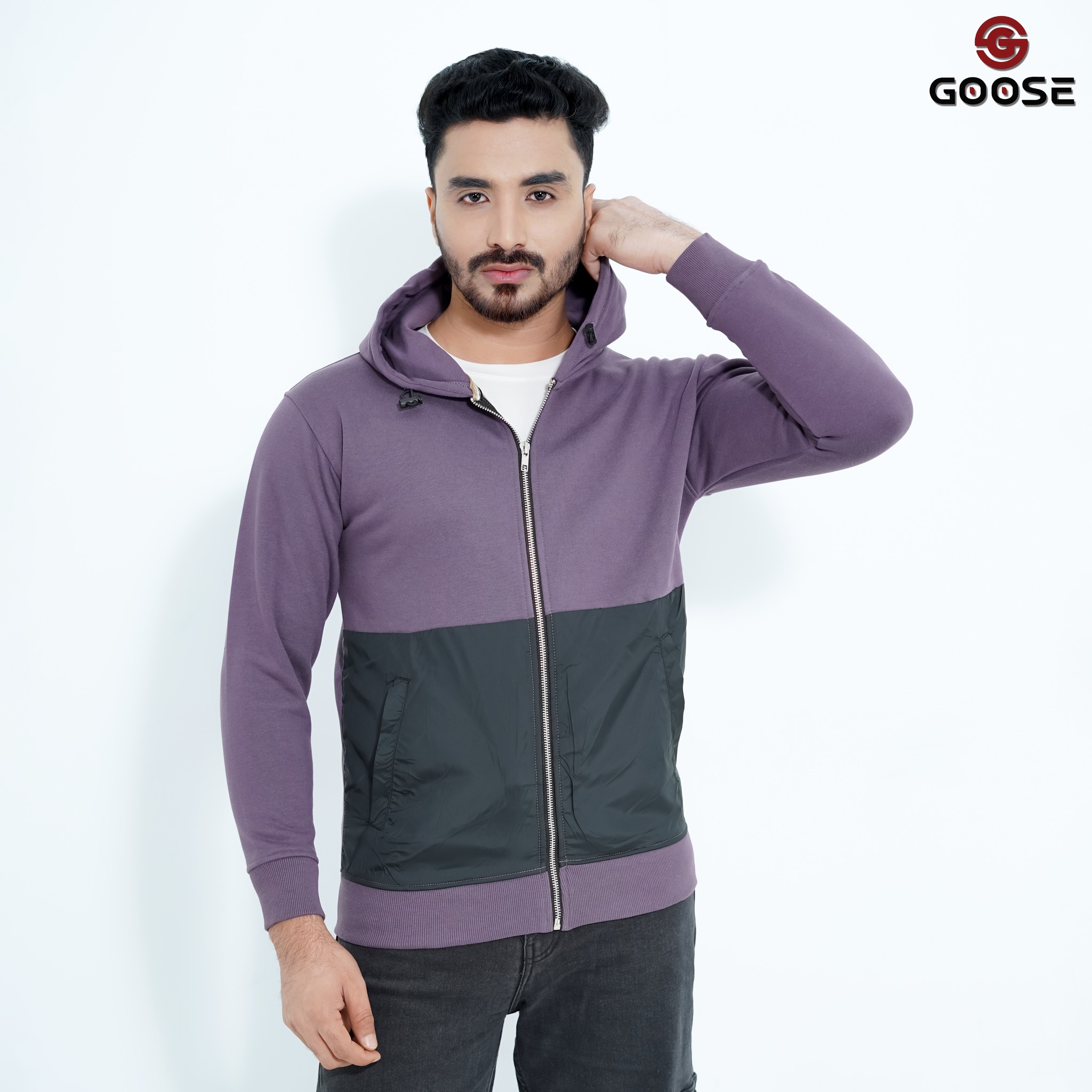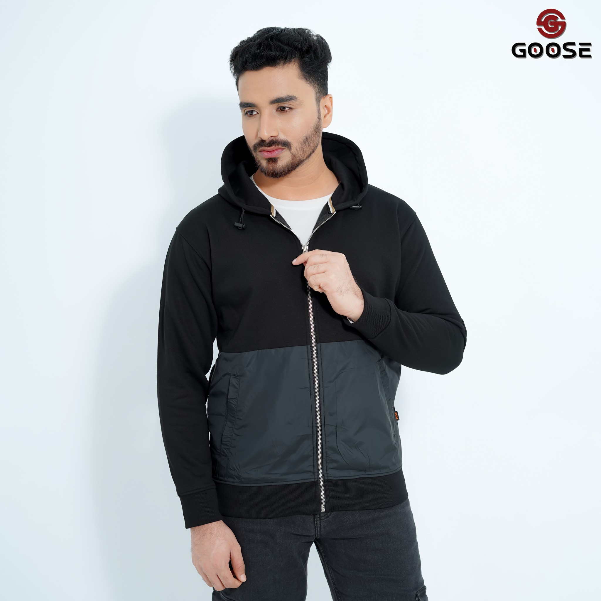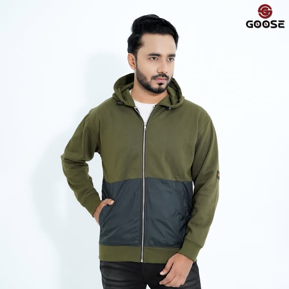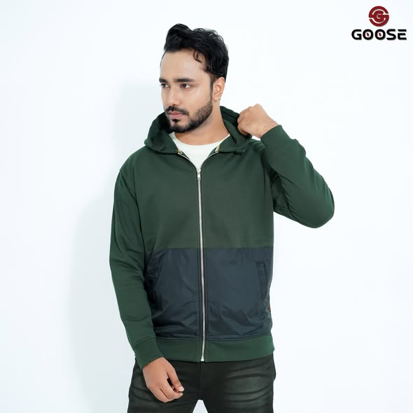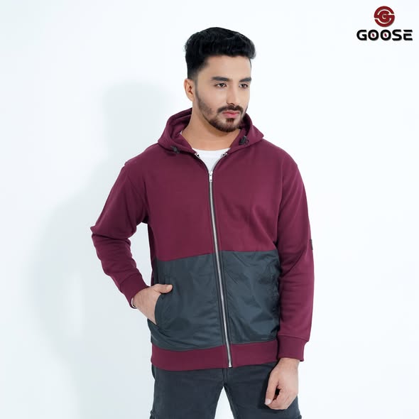 This is a stylish and functional men's zip-up hoodie, designed to be a core piece of the GOOSE Winter Collection. The garment features a striking two-tone color block design, primarily in a deep six colors on the upper body and sleeves, contrasted with a durable, textured black panel across the lower torso and pockets. Constructed for warmth and comfort, it includes an adjustable drawstring hood and a robust full-length front zipper for easy wear and layering. The design is finished with subtle ribbing at the cuffs and hem, ensuring a snug fit that locks in heat, making it an essential piece for cold-weather casual and streetwear.