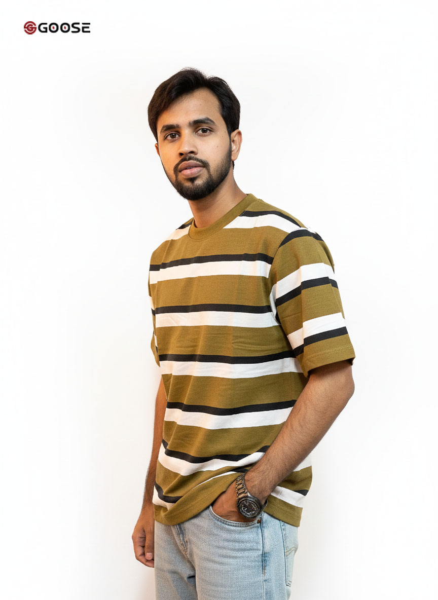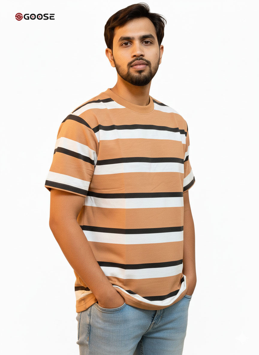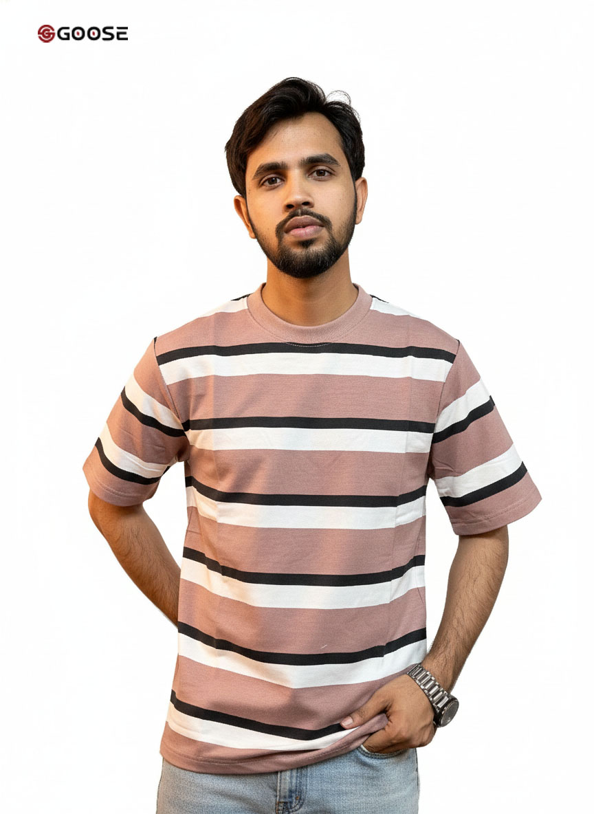 This is a vibrant, patterned Step Drop-Shoulder T-Shirt from GOOSE CLOTHING, included in their Summer Collection. The shirt features bold, classic horizontal stripes in White and Burgundy/Maroon. It is constructed from Goose Cross Terry Fabrics with a lightweight density of 250 GSM (Grams per Square Meter), ensuring a breathable, comfortable, and premium feel ideal for warm weather. The striped pattern is likely knit or dyed into the fabric (listed as "Non Printed"), and the "STEP DROP SHOULDER" design creates a contemporary, relaxed, and slightly oversized silhouette, making it a stylish and comfortable piece for casual wear.