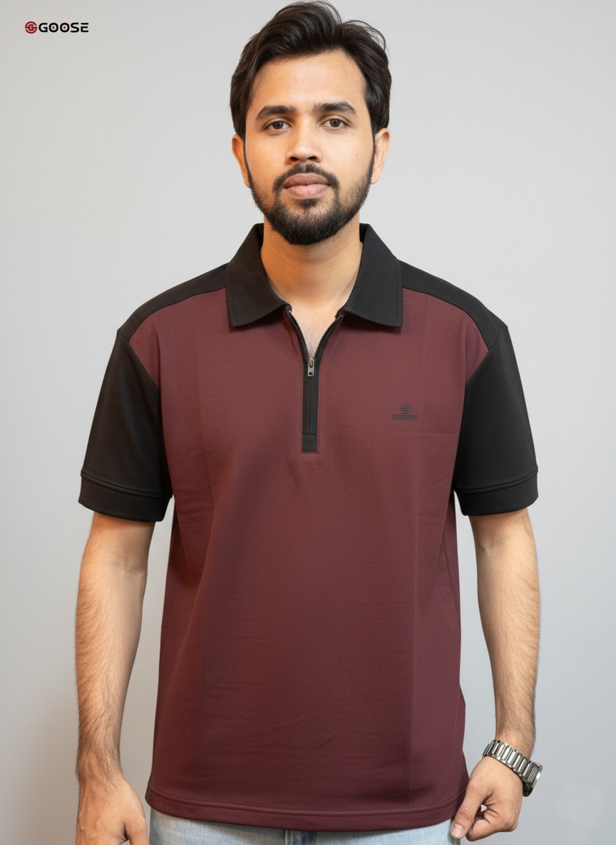 Design: A contemporary color-blocked polo featuring a deep maroon (burgundy) body contrasted with matte black sleeves and shoulders.