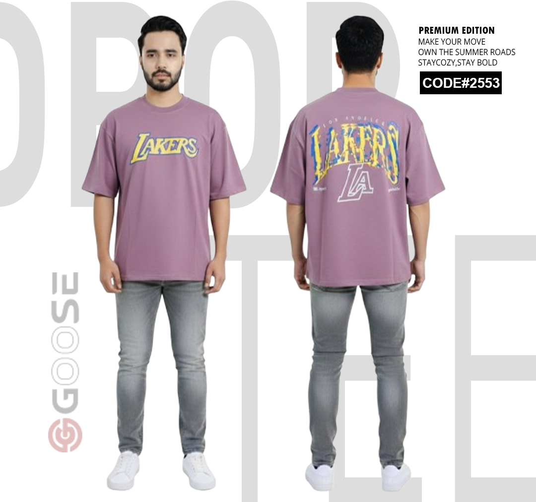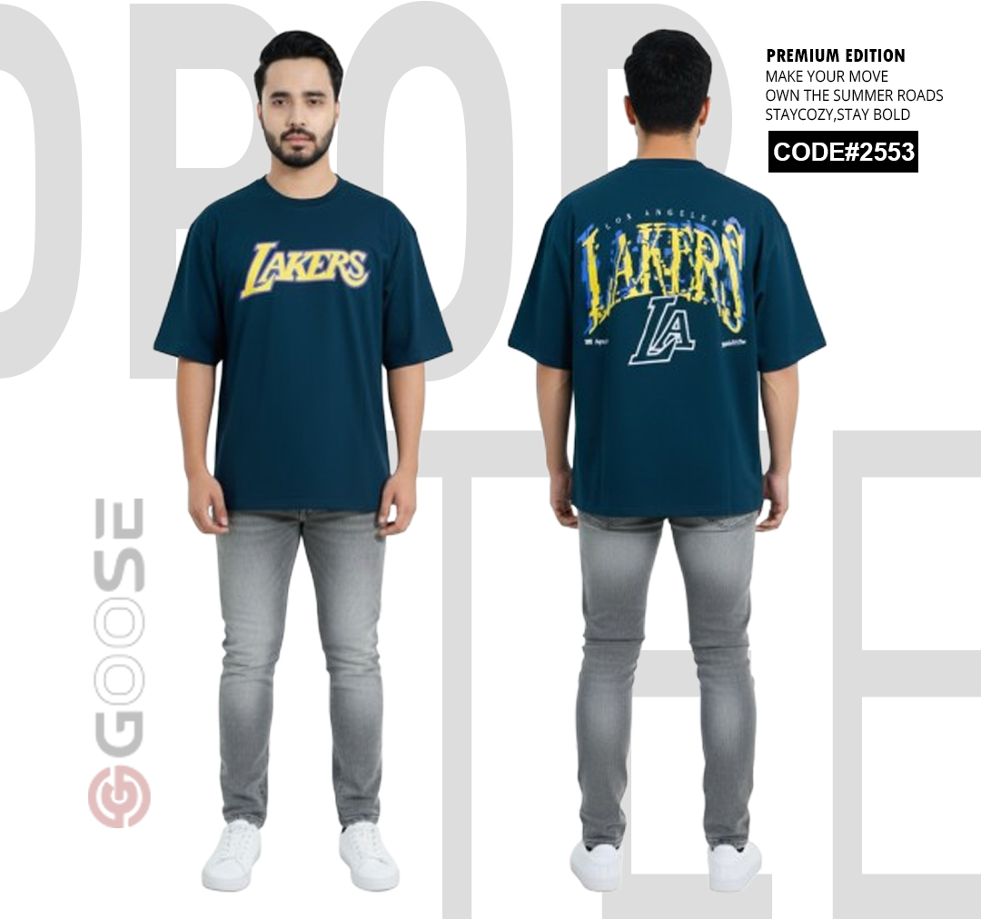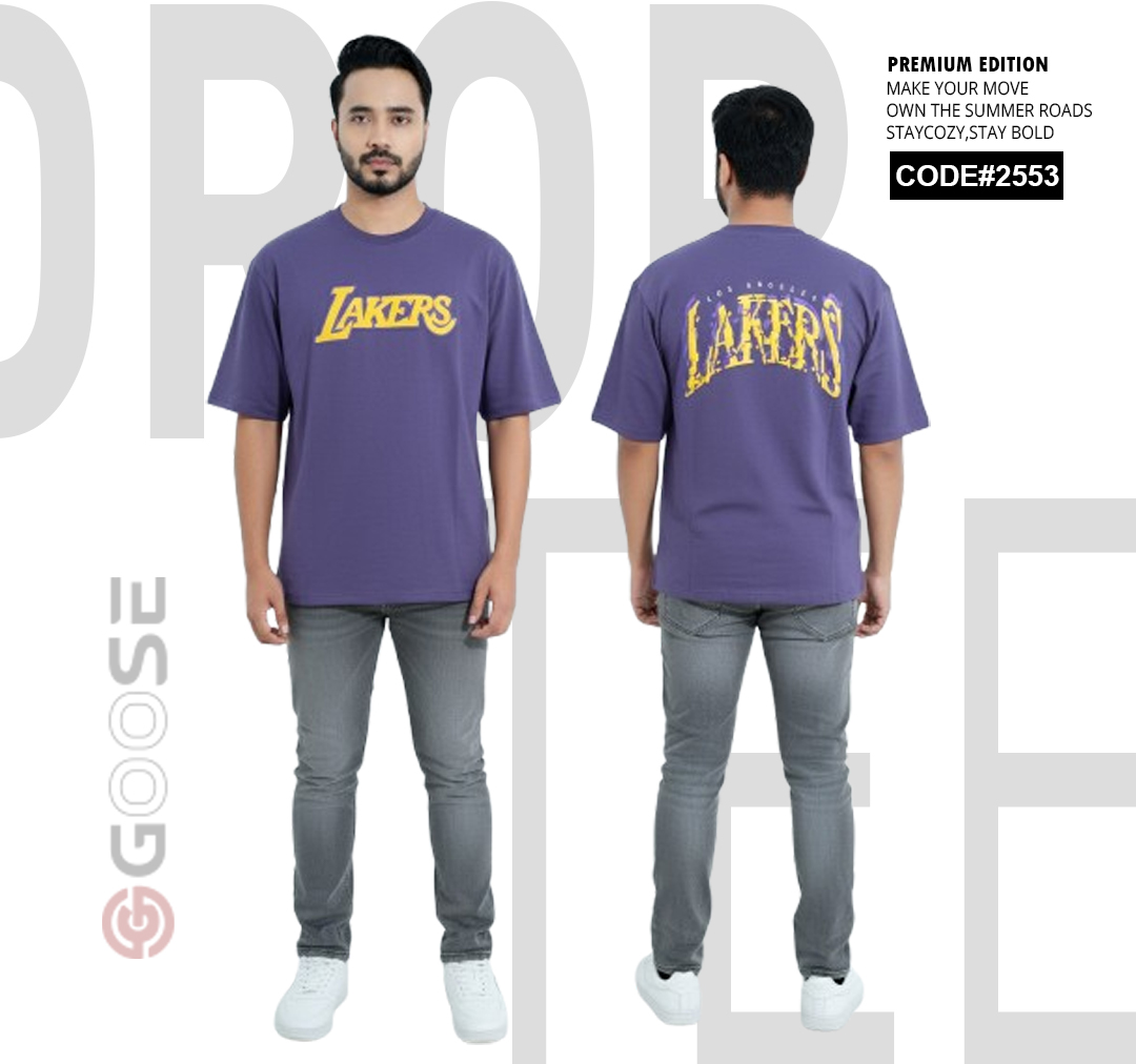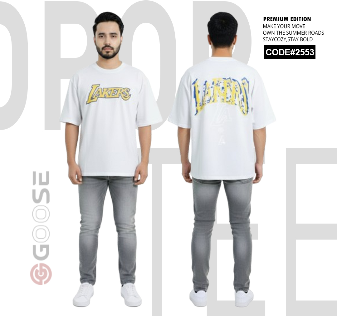 Show your team pride with a clean, contemporary edge in this White LAKERS Graphic T-Shirt. Designed for comfort, this tee features an oversized, relaxed fit perfect for streetwear or casual wear. The front prominently displays a bold, stylized "LAKERS" graphic in the iconic team colors—purple and gold—for a subtle yet spirited look. The back elevates the design with a large, multi-layered graphic incorporating the "LAKERS" wordmark and a striking outline of the "LA" abbreviation, making a strong visual statement. Crafted with quality in mind and branded by GOOSE, this t-shirt is a must-have piece for basketball fans seeking premium style and comfort.