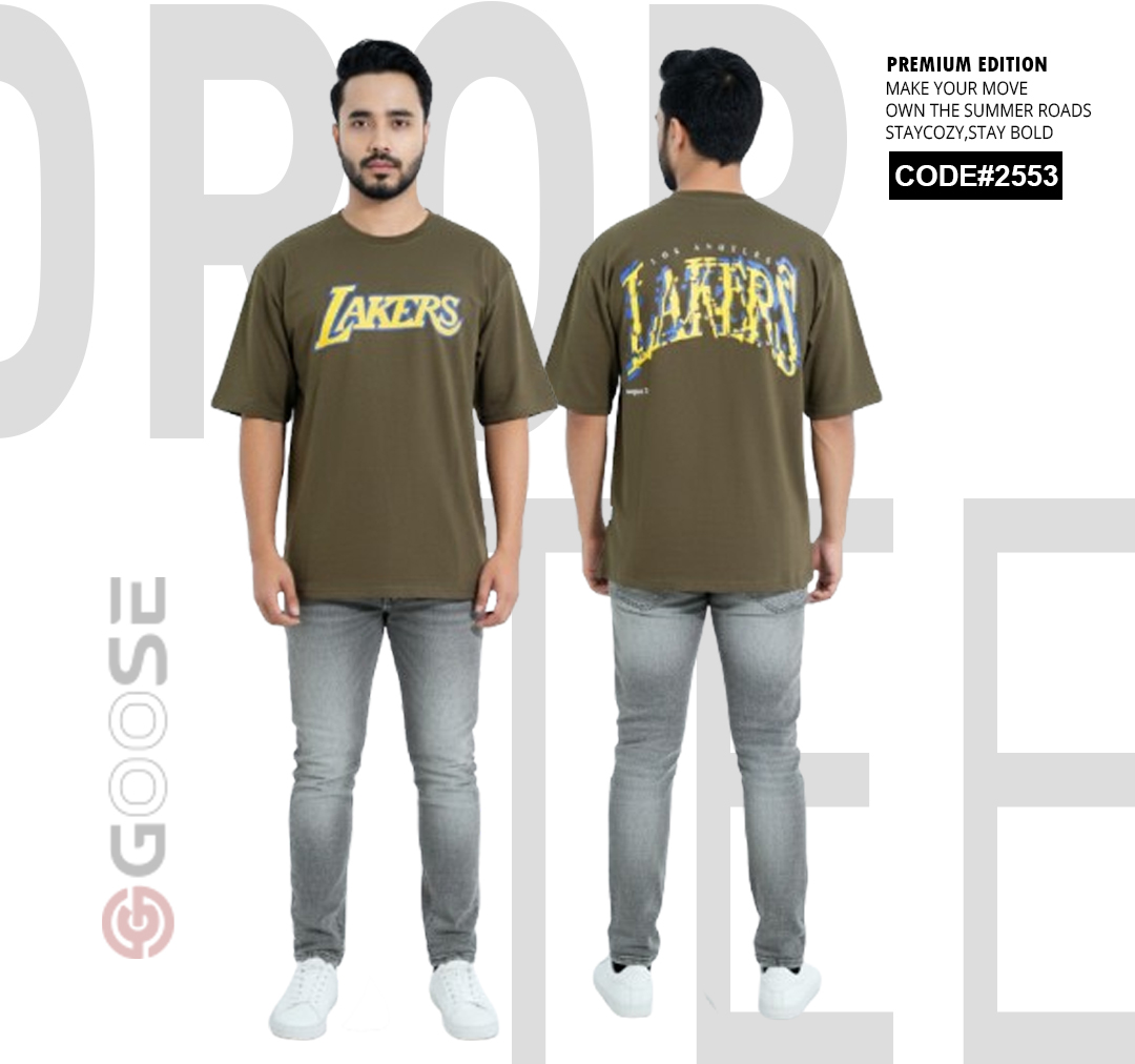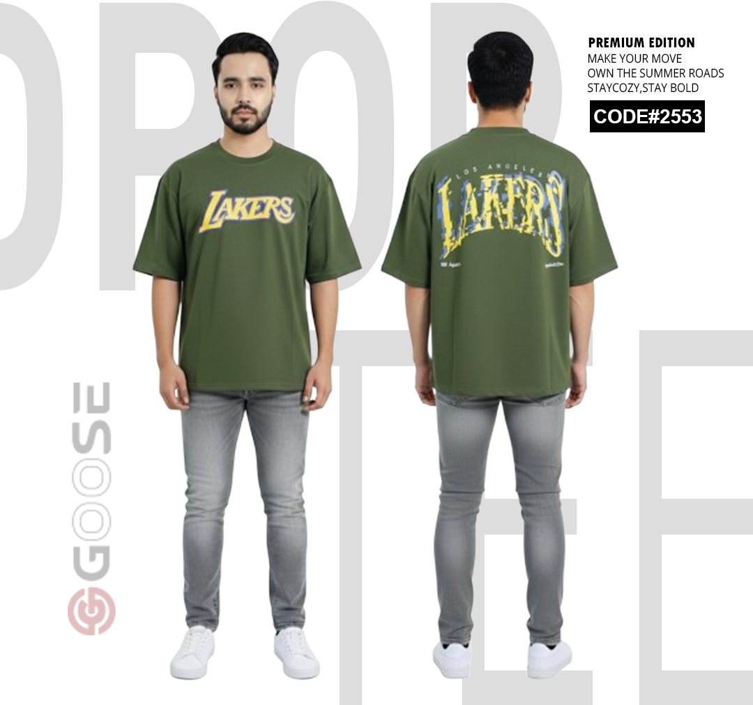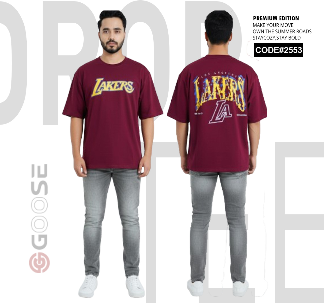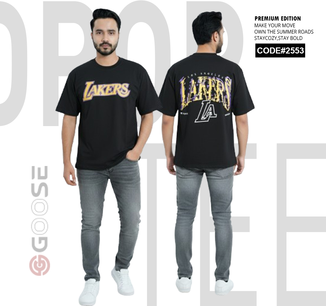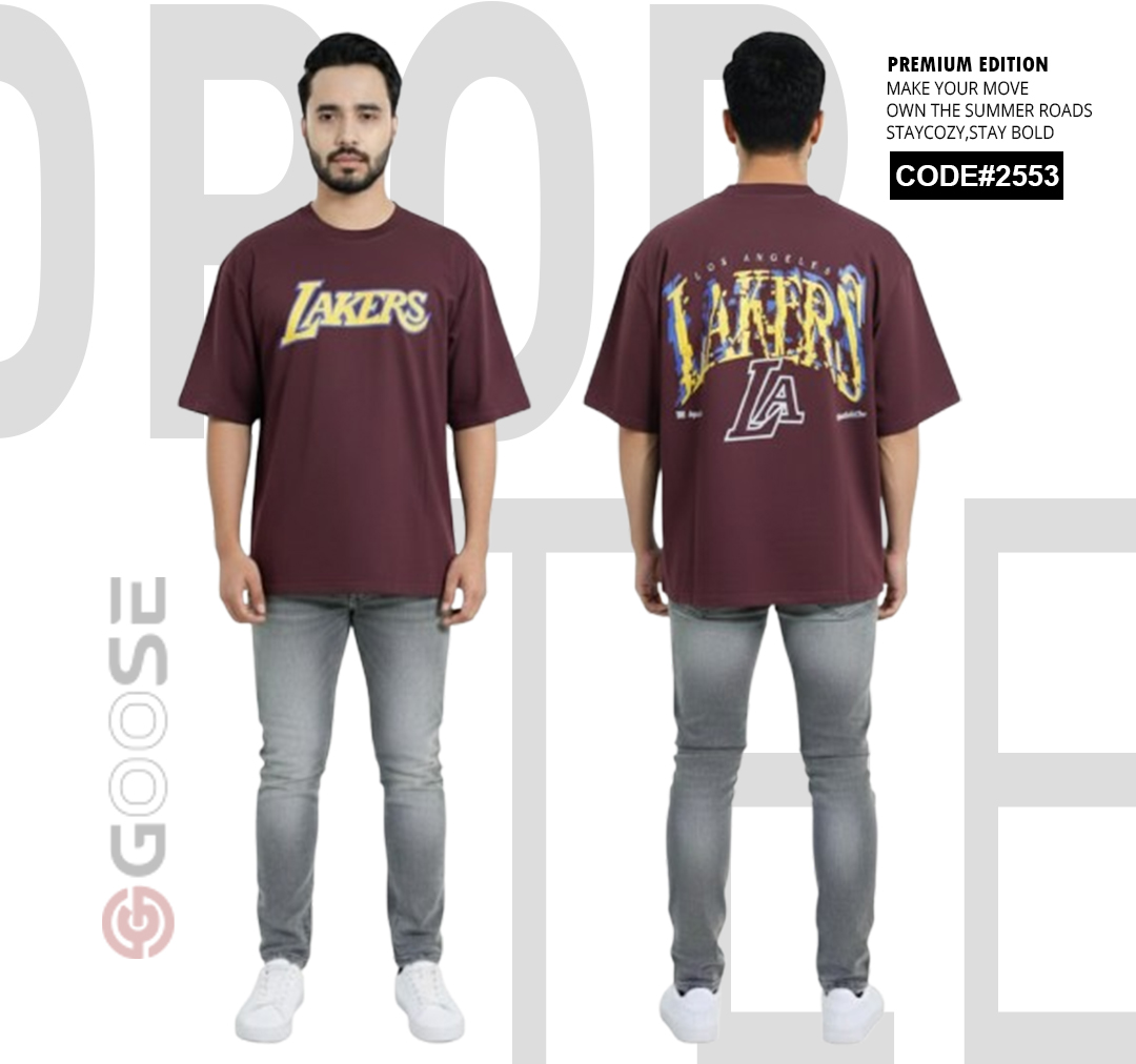 Show your team pride with a clean, contemporary edge in this White LAKERS Graphic T-Shirt. Designed for comfort, this tee features an oversized, relaxed fit perfect for streetwear or casual wear. The front prominently displays a bold, stylized "LAKERS" graphic in the iconic team colors—purple and gold—for a subtle yet spirited look. The back elevates the design with a large, multi-layered graphic incorporating the "LAKERS" wordmark and a striking outline of the "LA" abbreviation, making a strong visual statement. Crafted with quality in mind and branded by GOOSE, this t-shirt is a must-have piece for basketball fans seeking premium style and comfort.