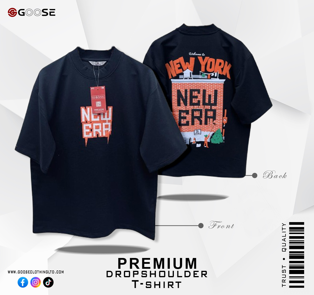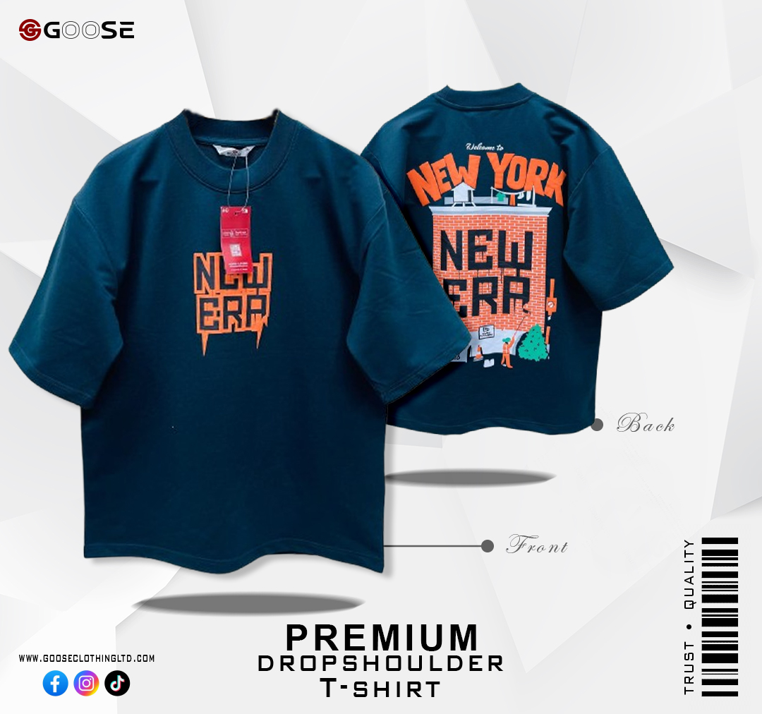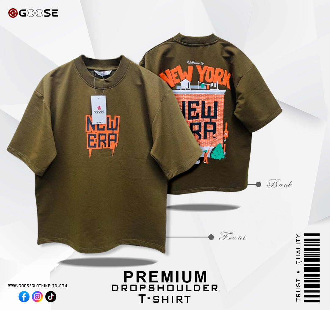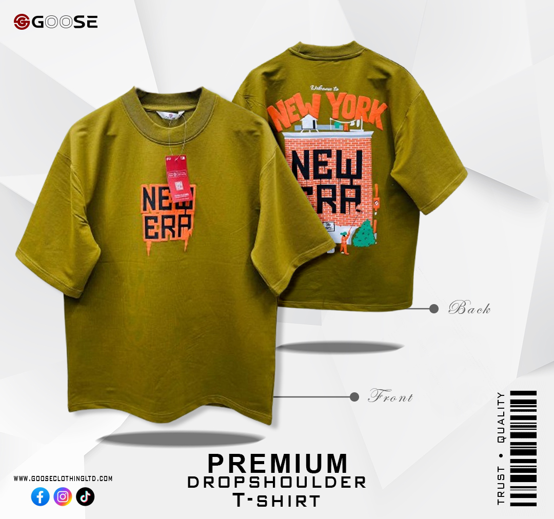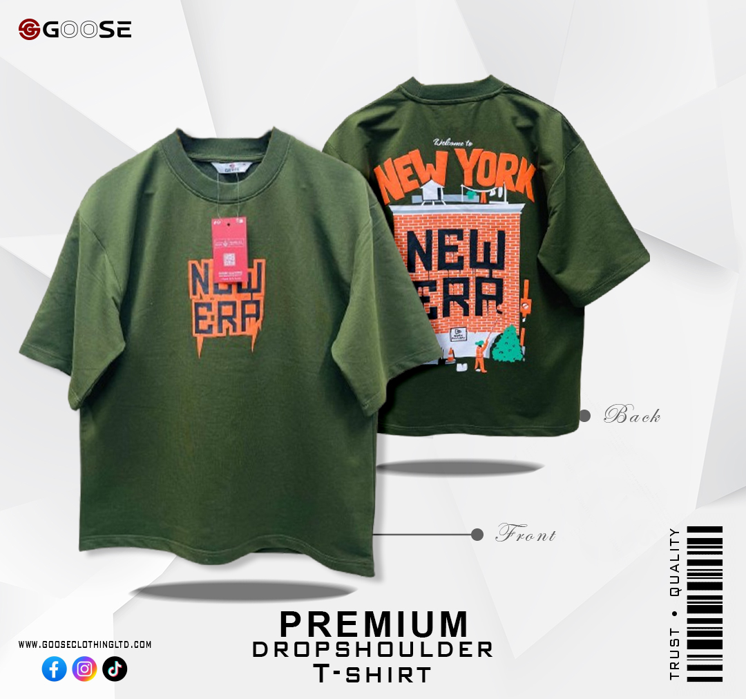This is an oversized, dark green (or olive/forest green) t-shirt featuring a bold, street-art inspired design. The front of the shirt displays the text "NEW ERA" in a distressed black font overlaid with an orange paint splatter graphic. The back of the shirt features a more detailed graphic: the text "Welcome to NEW YORK" in orange arching over a detailed brick wall illustration. The text "NEW ERA" is centrally placed on the brick wall, which is adorned with street-level elements like plants, a garbage bag, and small figures. The shirt has a loose, comfortable fit and is branded with the GOOSE logo on the upper right side of the back.