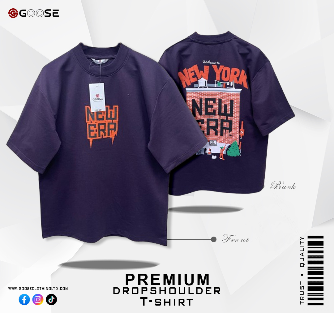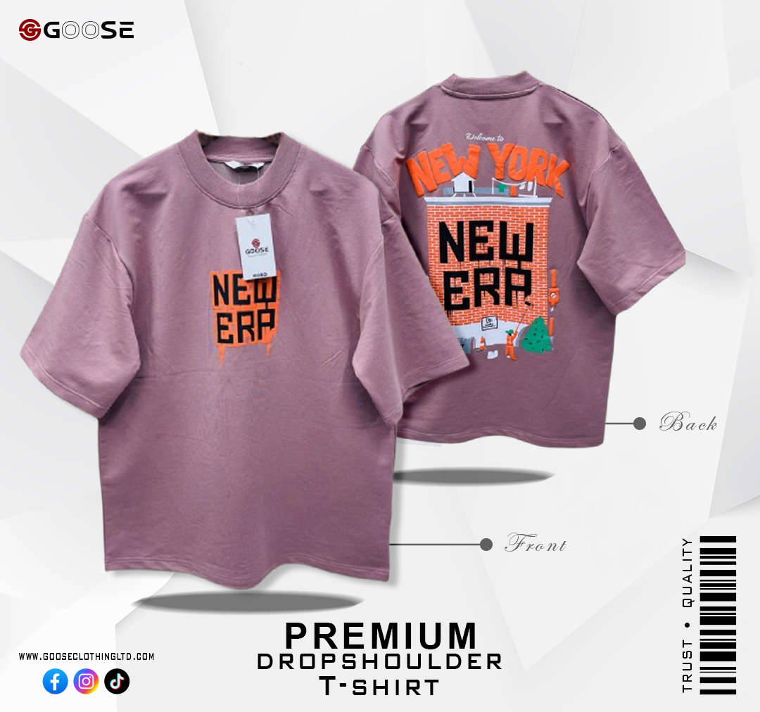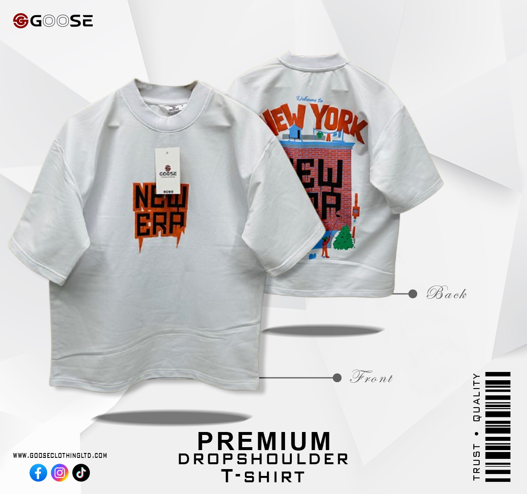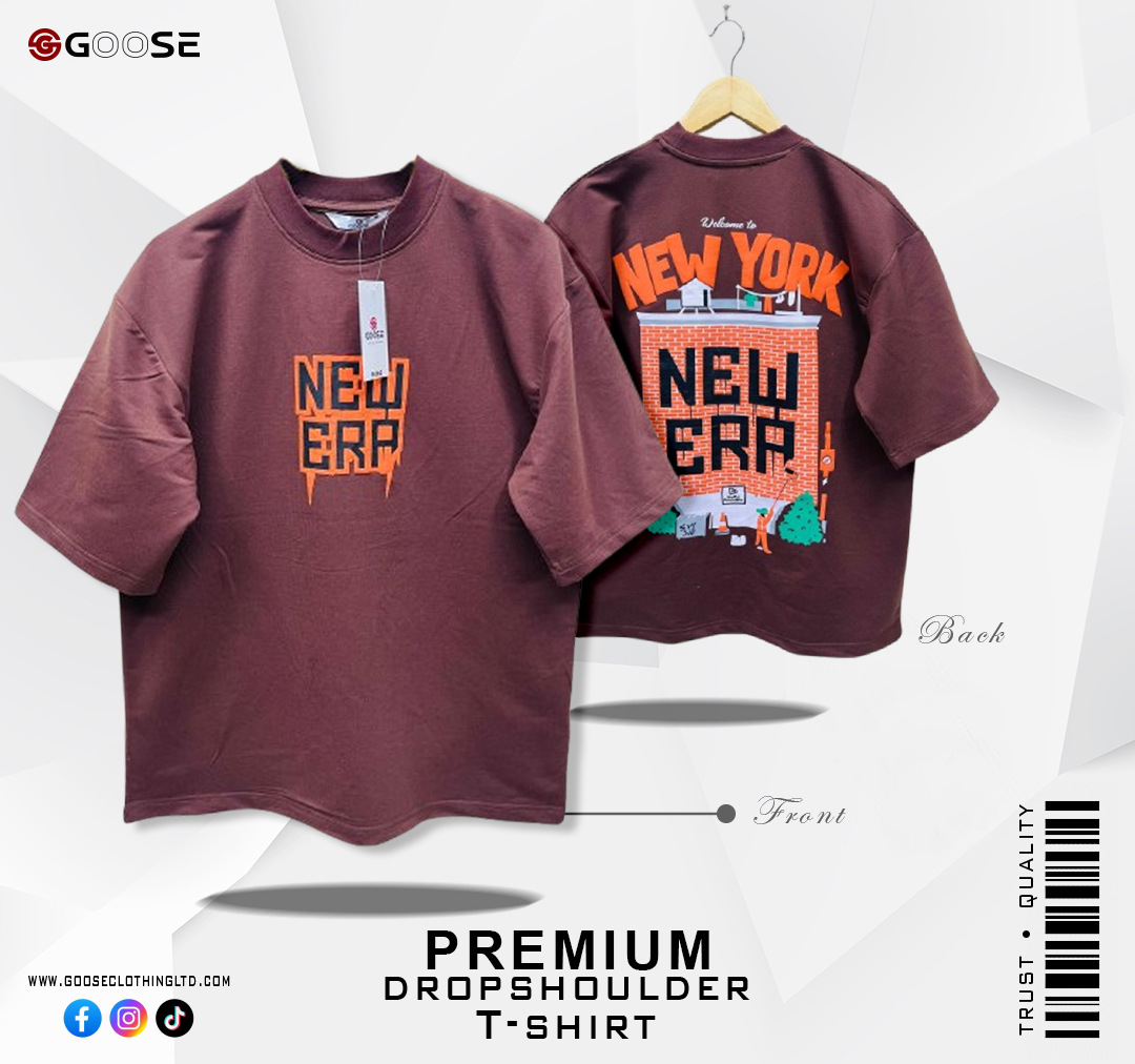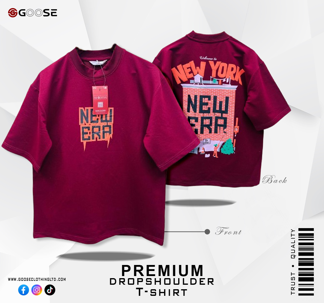 This is an oversized, dark green (or olive/forest green) t-shirt featuring a bold, street-art inspired design. The front of the shirt displays the text "NEW ERA" in a distressed black font overlaid with an orange paint splatter graphic. The back of the shirt features a more detailed graphic: the text "Welcome to NEW YORK" in orange arching over a detailed brick wall illustration. The text "NEW ERA" is centrally placed on the brick wall, which is adorned with street-level elements like plants, a garbage bag, and small figures. The shirt has a loose, comfortable fit and is branded with the GOOSE logo on the upper right side of the back.