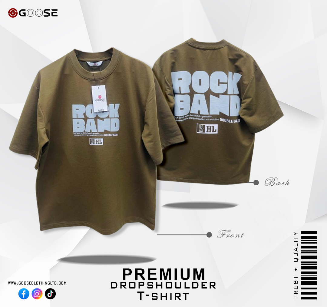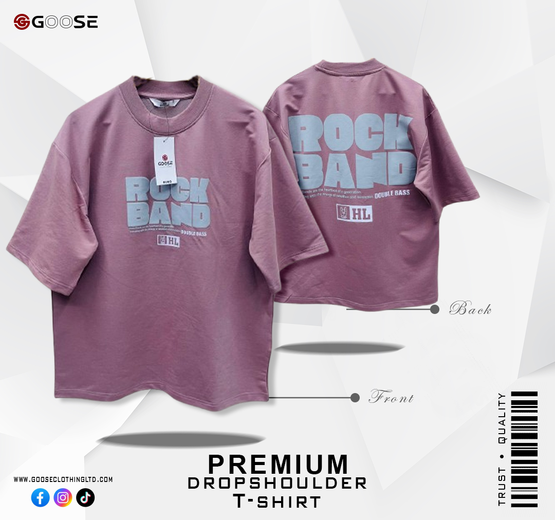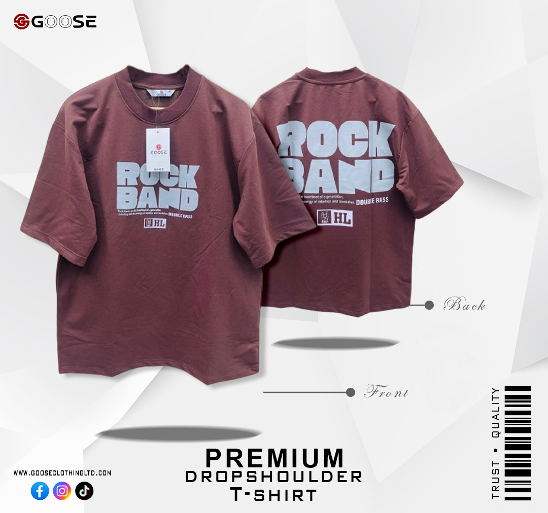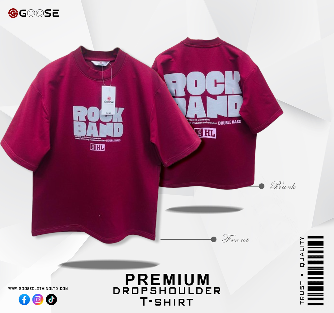 This is a Premium Dropshoulder T-Shirt in the same deep maroon or burgundy color, maintaining the relaxed, oversized, streetwear style with dropped shoulders. The main design theme is "ROCK BAND". The front features the large text "ROCK BAND" in bold, white block letters, accompanied by a small graphic element and the letters "HL" in a red box below, alongside smaller text. The back mirrors this design with a large "ROCK BAND" graphic, adding a line of text that mentions "event of a generation" and "DOUBLE BASS," confirming the musical/band theme. This T-shirt is designed for comfort and a bold statement, clearly marketed as a high-quality (PREMIUM) item.