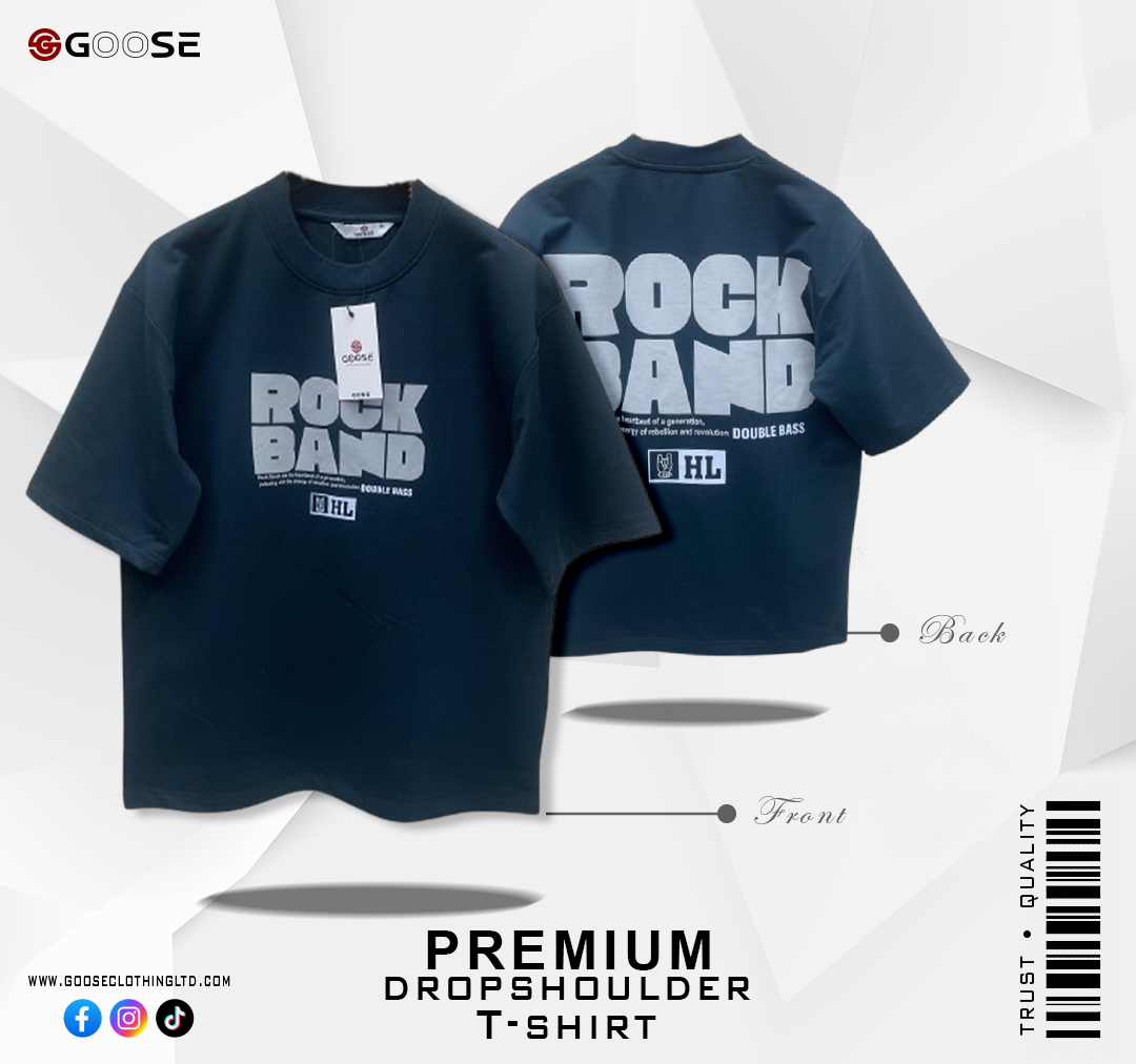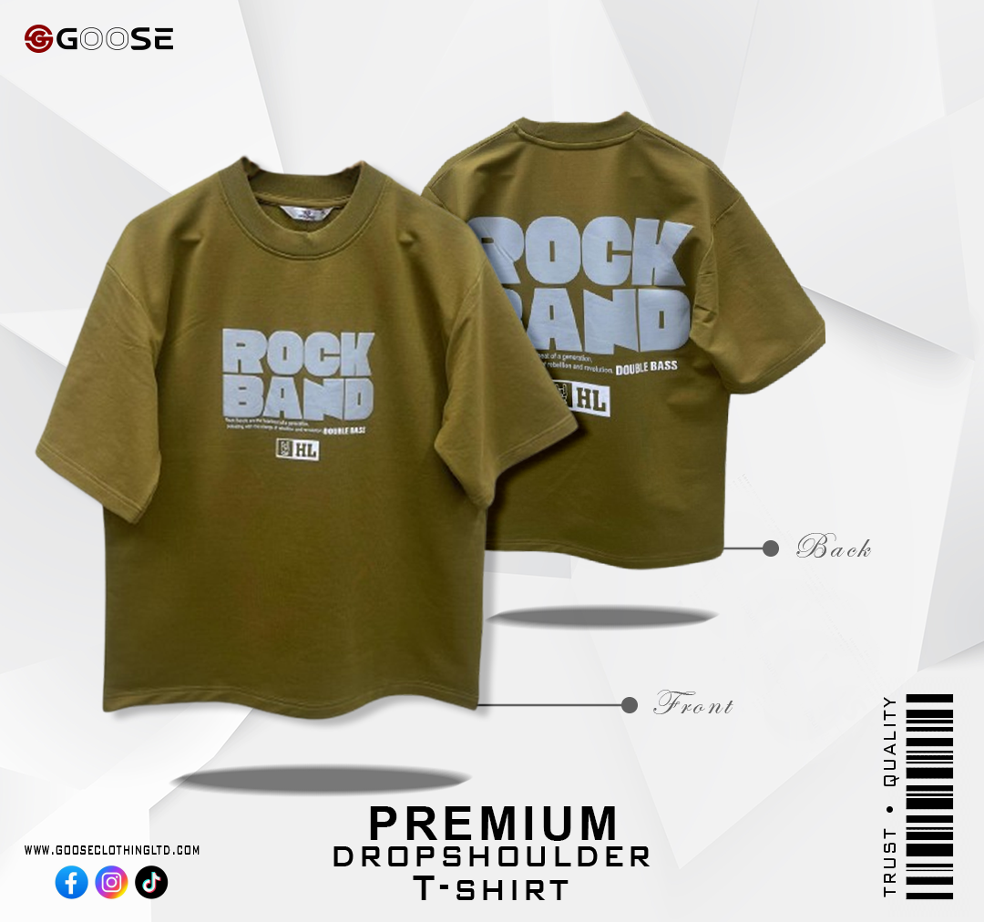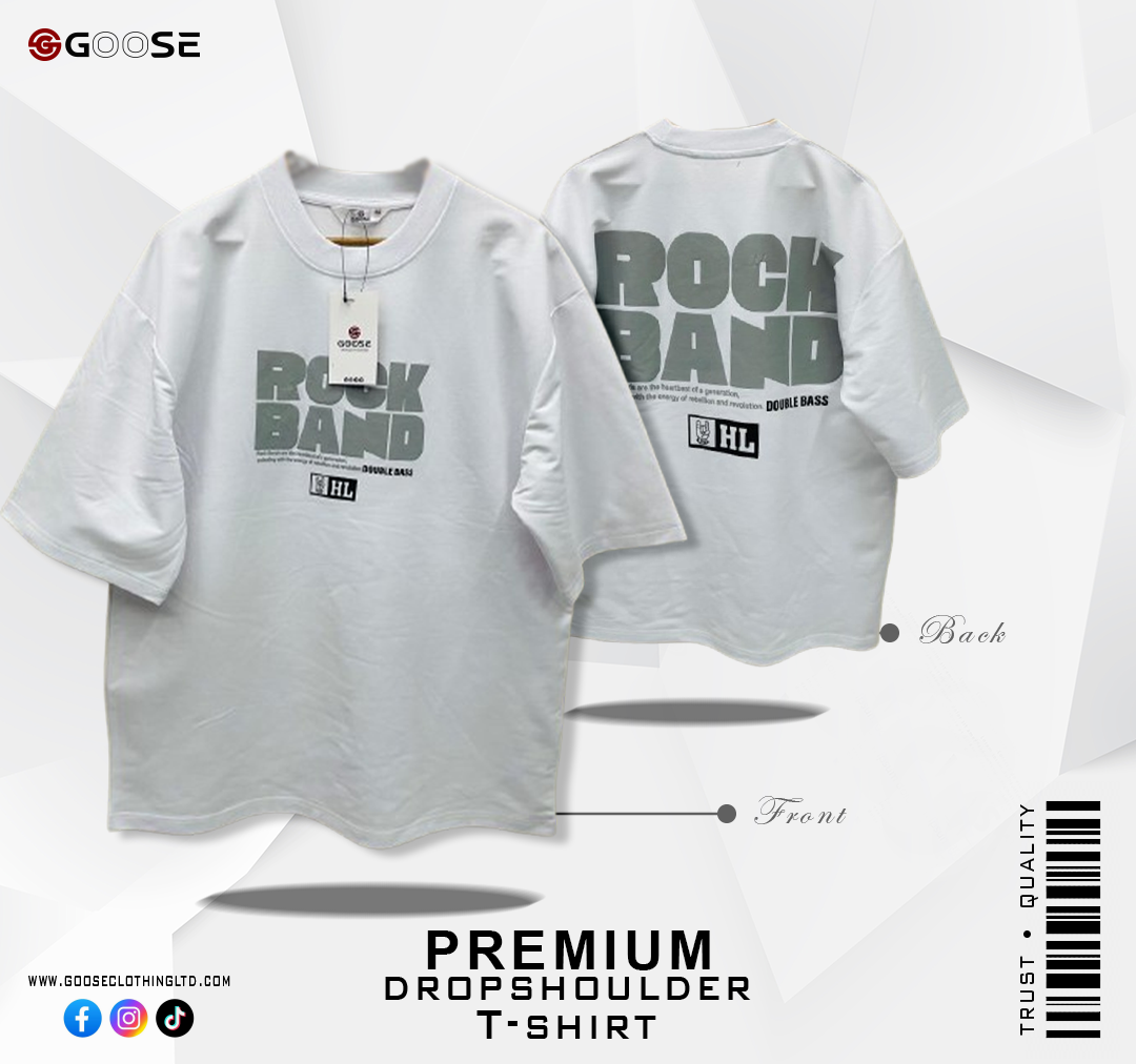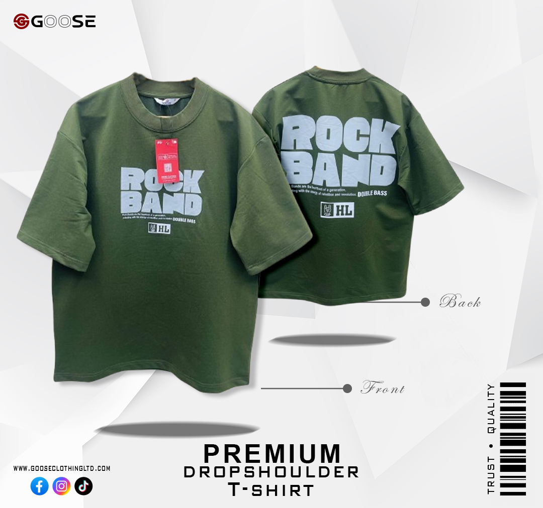 This is a Premium Dropshoulder T-Shirt in the same deep maroon or burgundy color, maintaining the relaxed, oversized, streetwear style with dropped shoulders. The main design theme is "ROCK BAND". The front features the large text "ROCK BAND" in bold, white block letters, accompanied by a small graphic element and the letters "HL" in a red box below, alongside smaller text. The back mirrors this design with a large "ROCK BAND" graphic, adding a line of text that mentions "event of a generation" and "DOUBLE BASS," confirming the musical/band theme. This T-shirt is designed for comfort and a bold statement, clearly marketed as a high-quality (PREMIUM) item.